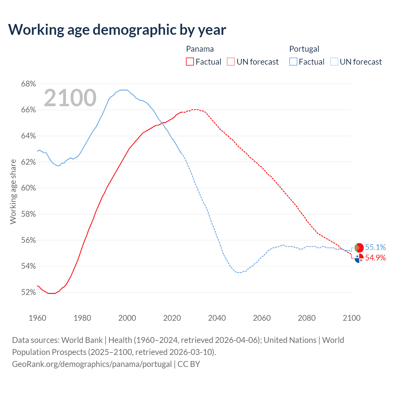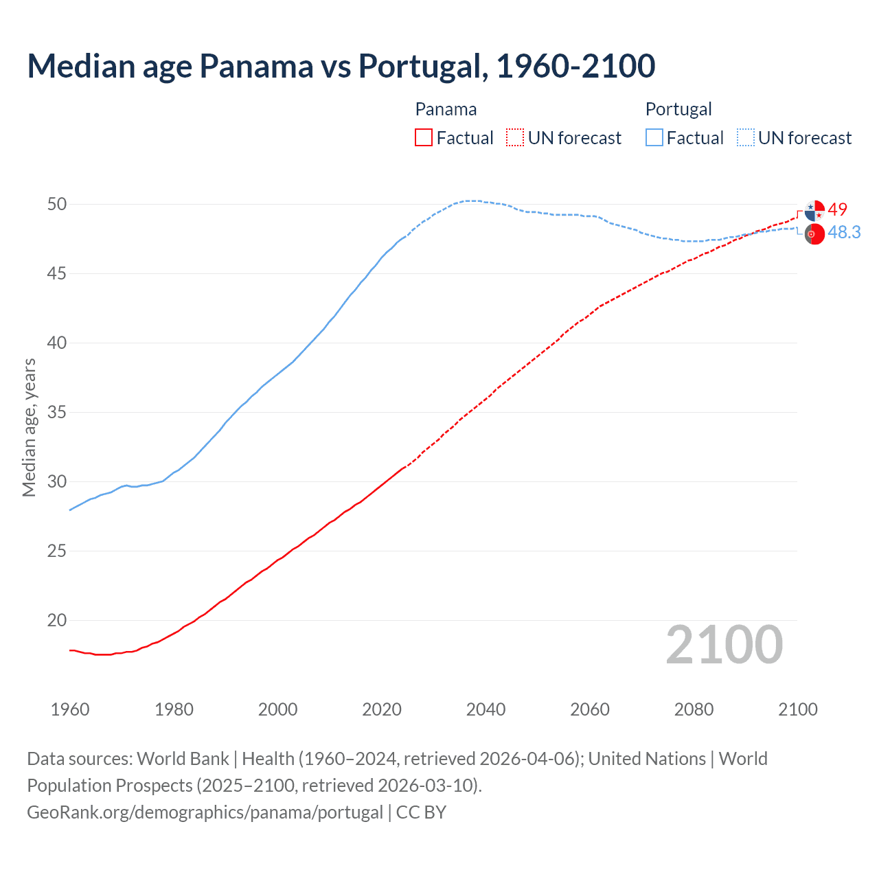 Median age Panama vs Portugal, 1960-2100