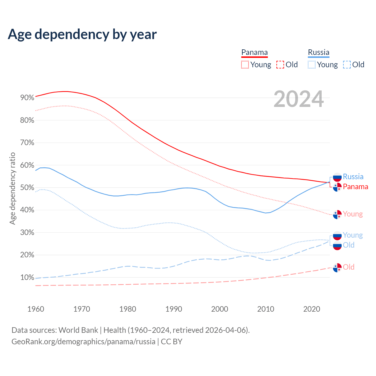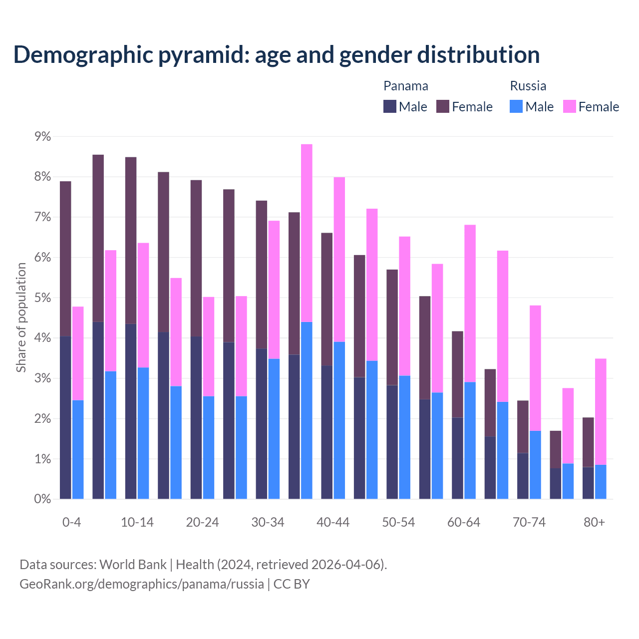 - Panama is ranked 94/196 by median age (oldest to youngest) vs 42/196 for Russia.