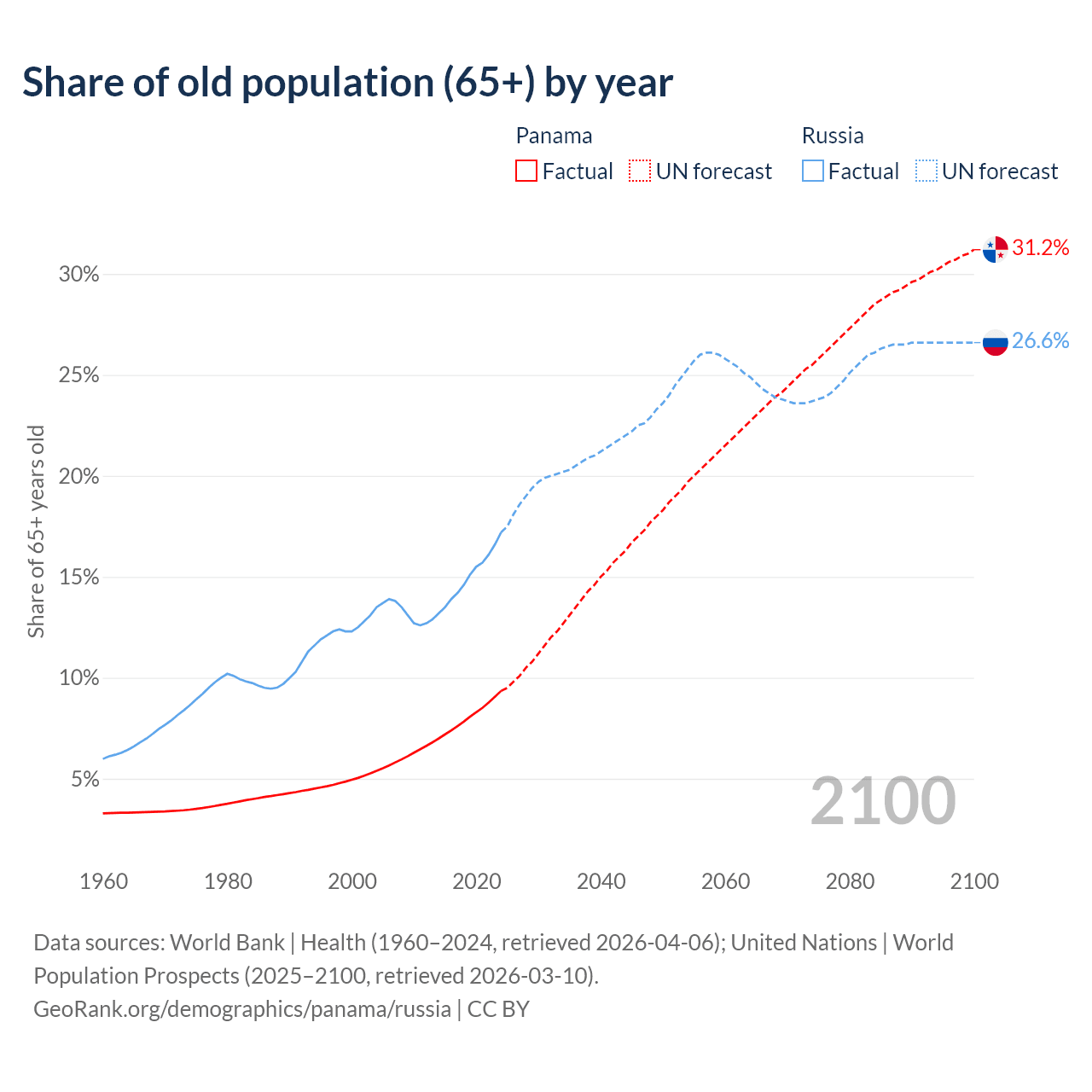 - The share of old-age demographic (65+) in Panama is 9.35% vs 17.2% in Russia.