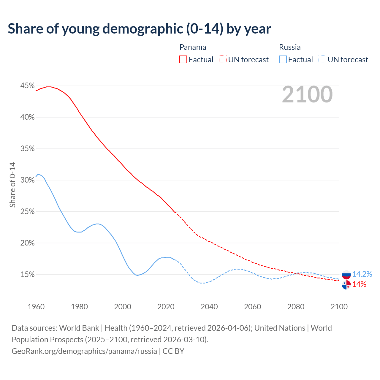 - The share of young demographic (0-15 years old) in Panama is 24.9% vs 17.3% in Russia.