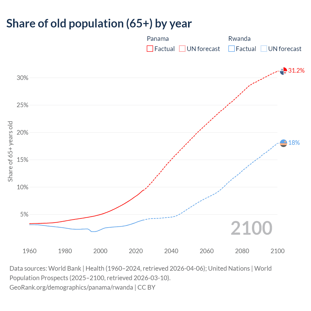 - The share of old-age demographic (65+) in Panama is 9.35% vs 3.93% in Rwanda.