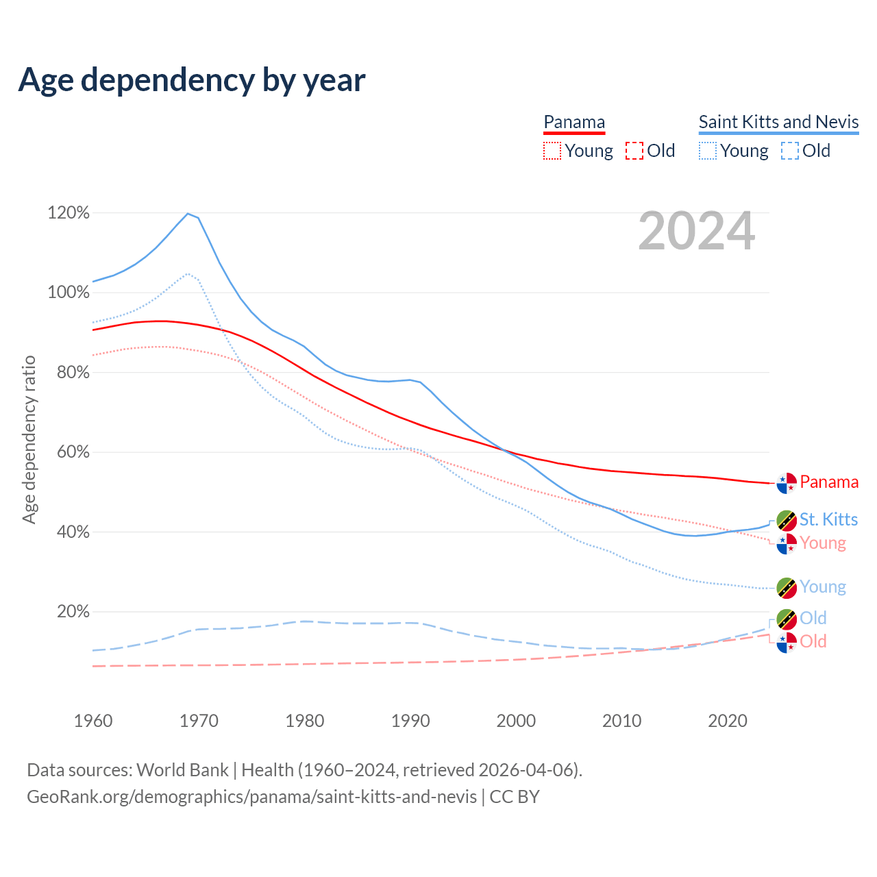 - The share of young demographic (0-15 years old) in Panama is 24.9% vs 18.2% in Saint Kitts and Nevis.