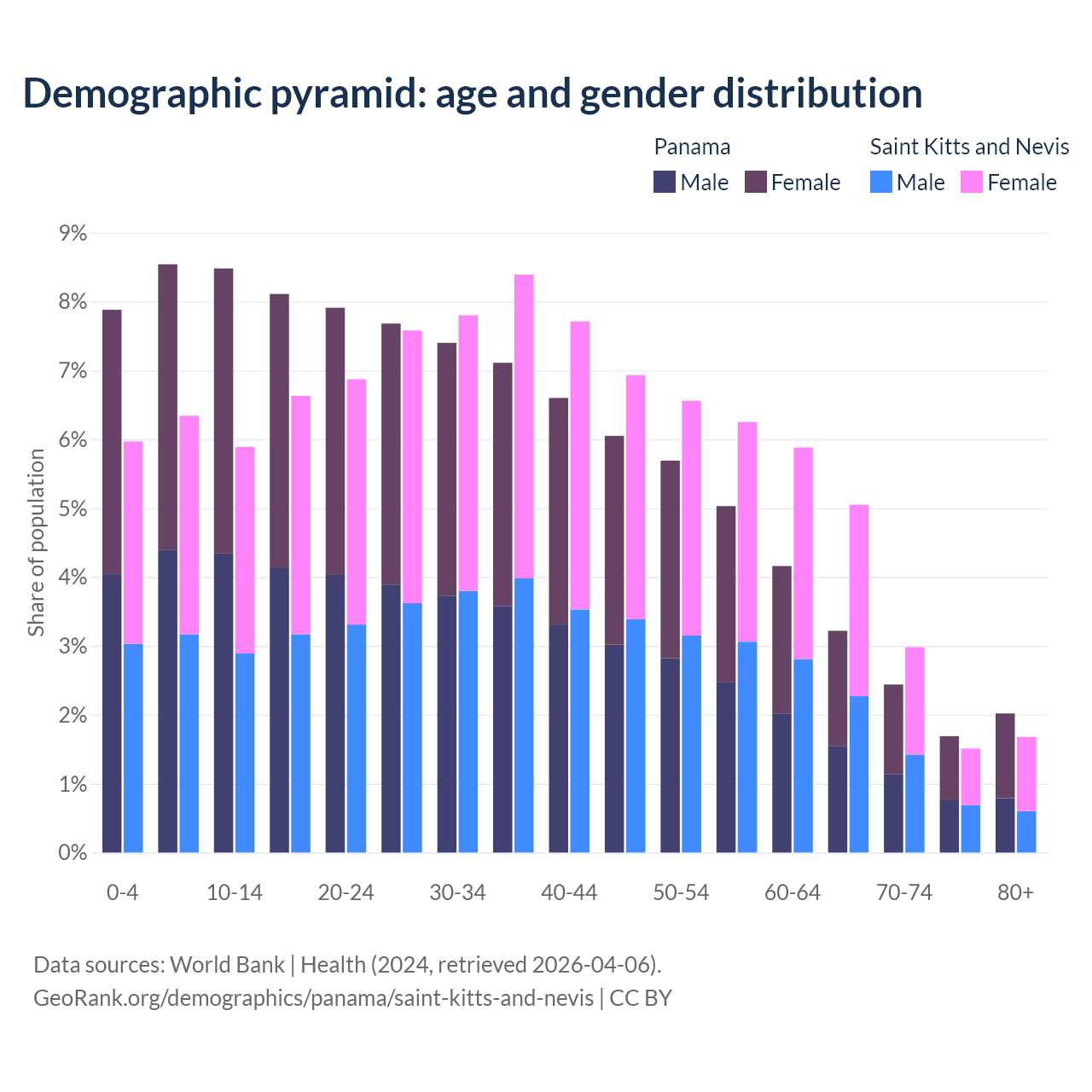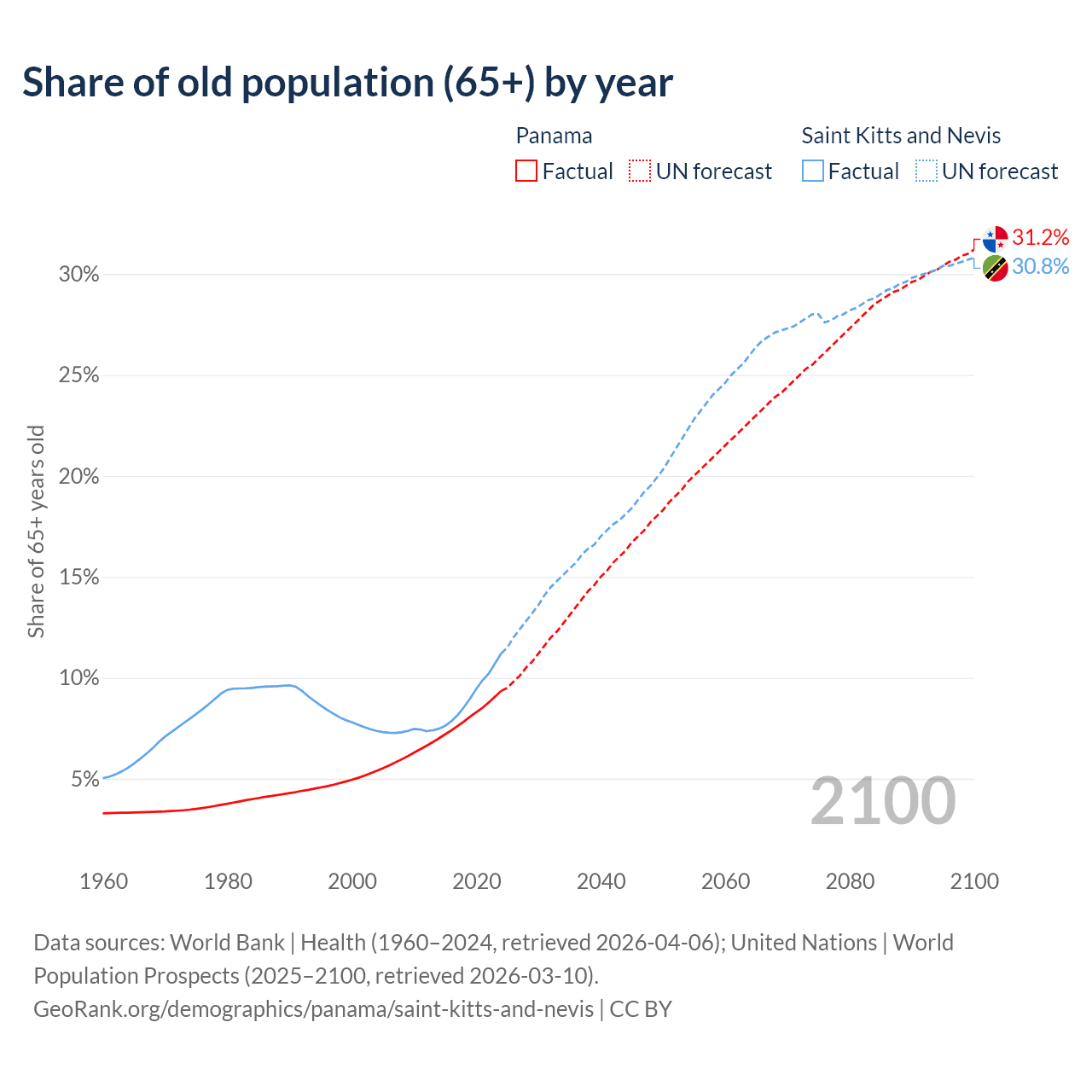 The share of older people aged 65 and over is 9.35% in Panama and 11.2% in Saint Kitts and Nevis. Life expectancy in Panama compared to Saint Kitts and Nevis .