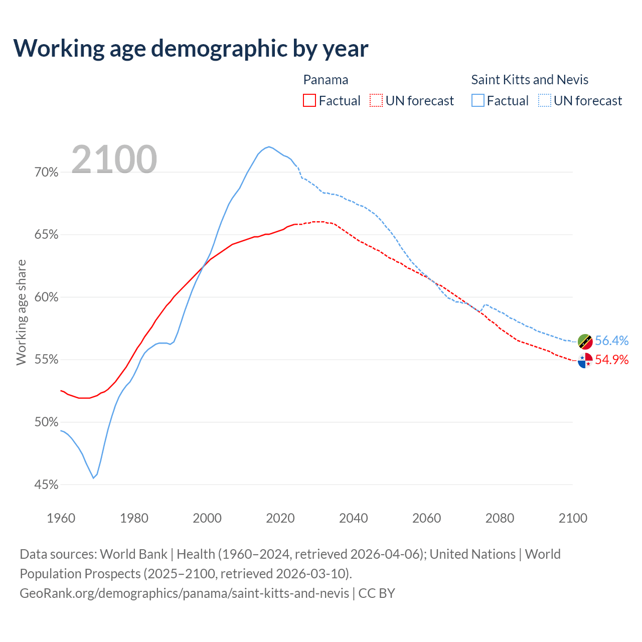 - Panama has 3.05M working age adults (aged 15-64) vs 33.2K in Saint Kitts and Nevis.