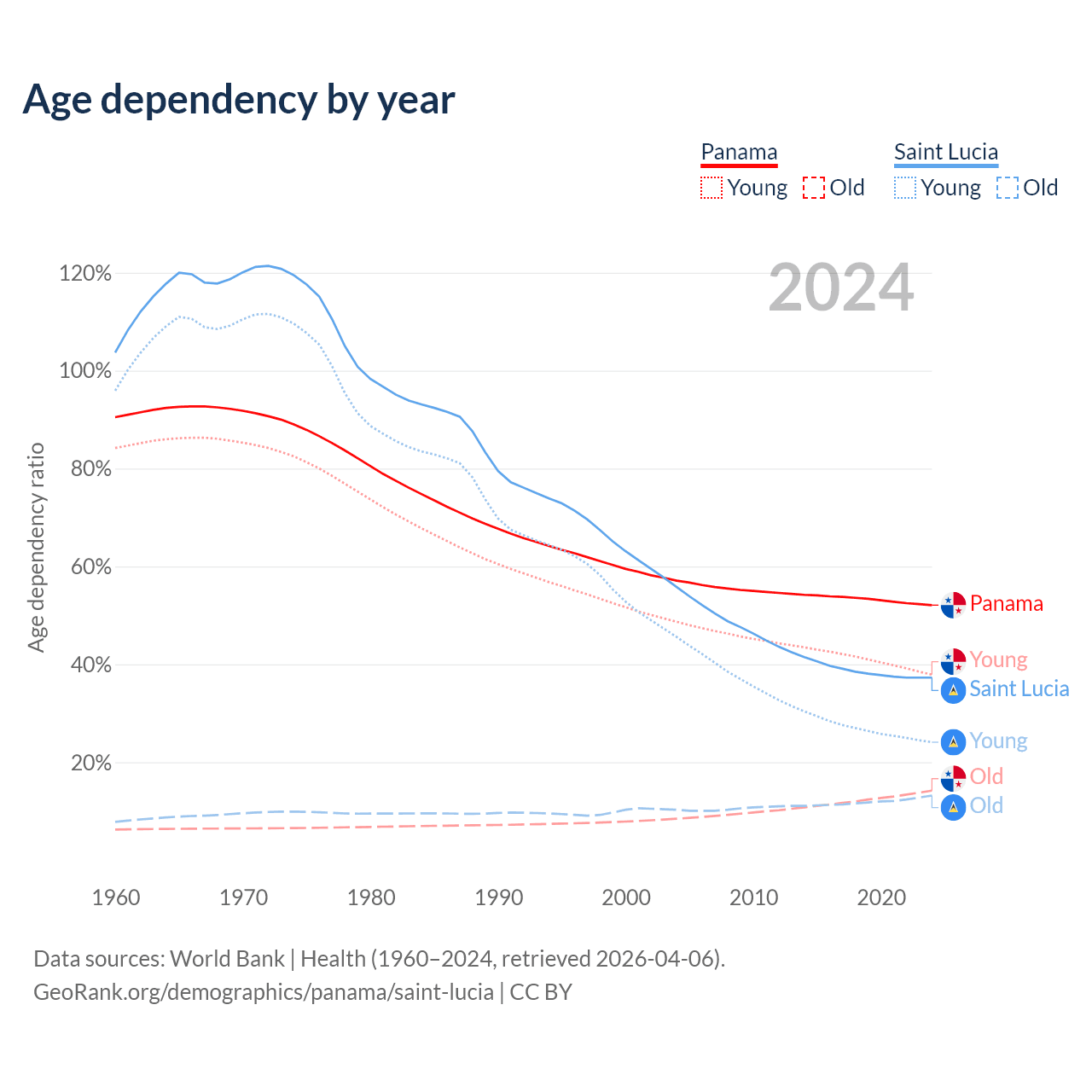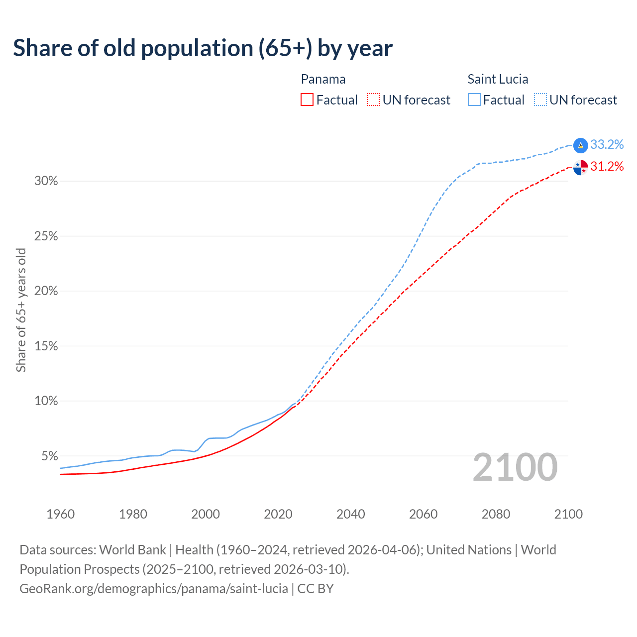 - The share of old-age demographic (65+) in Panama is 9.35% vs 9.62% in Saint Lucia.
