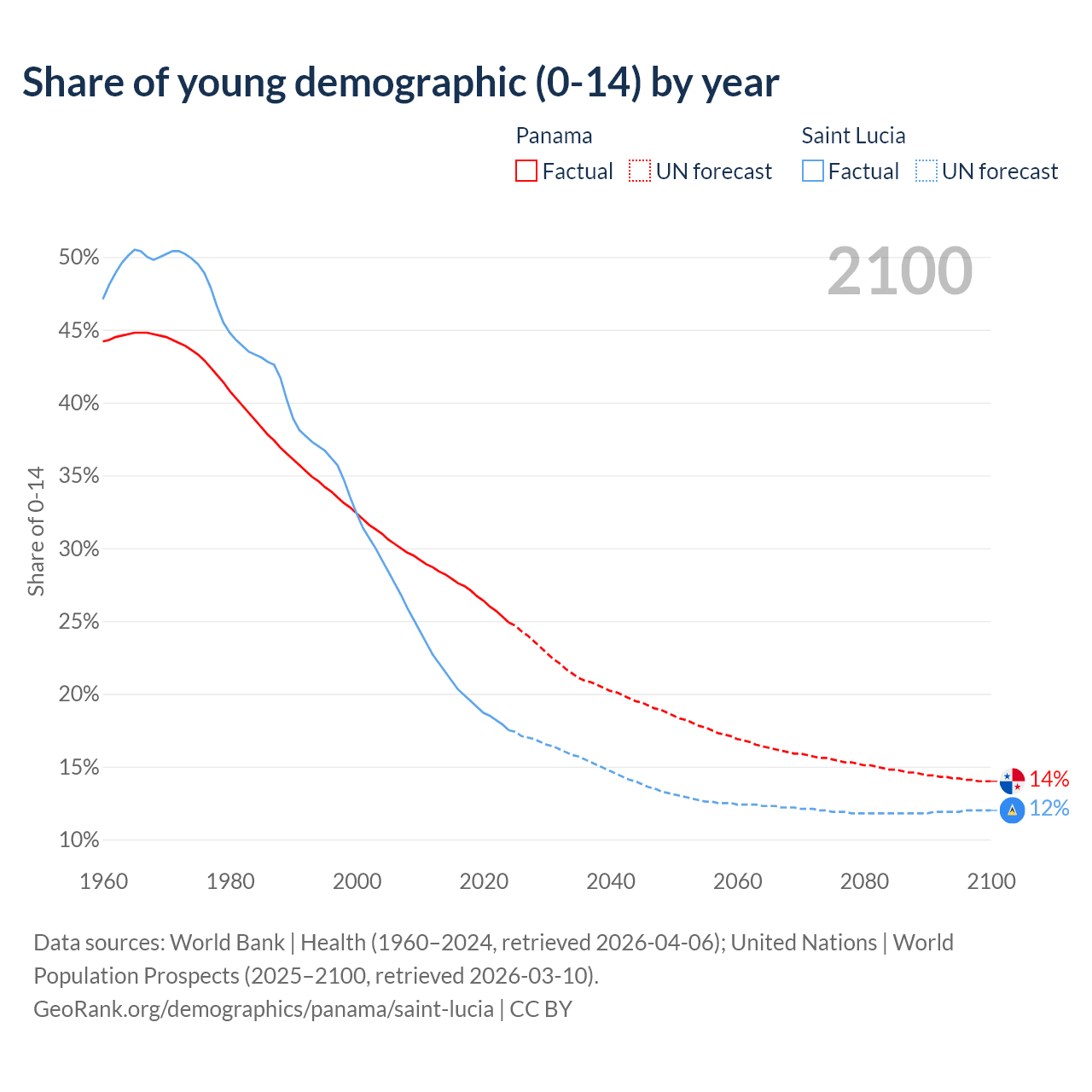 - The share of young demographic (0-15 years old) in Panama is 24.9% vs 17.5% in Saint Lucia.