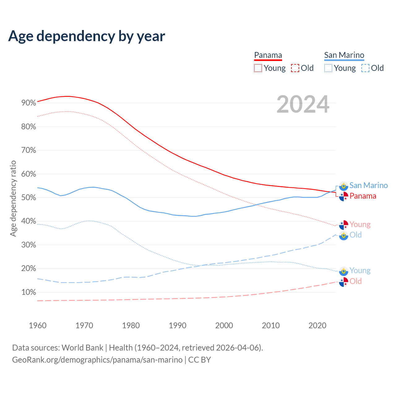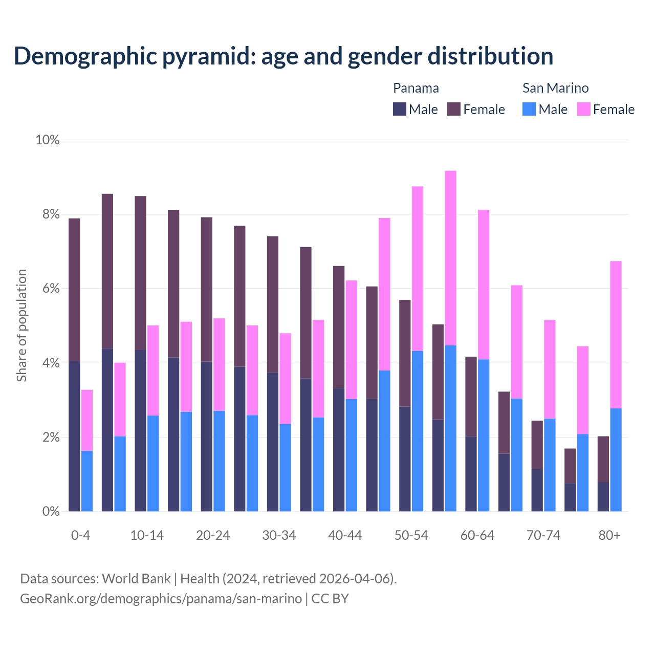 - Panama is ranked 94/196 by median age (oldest to youngest) vs 3/196 for San Marino.