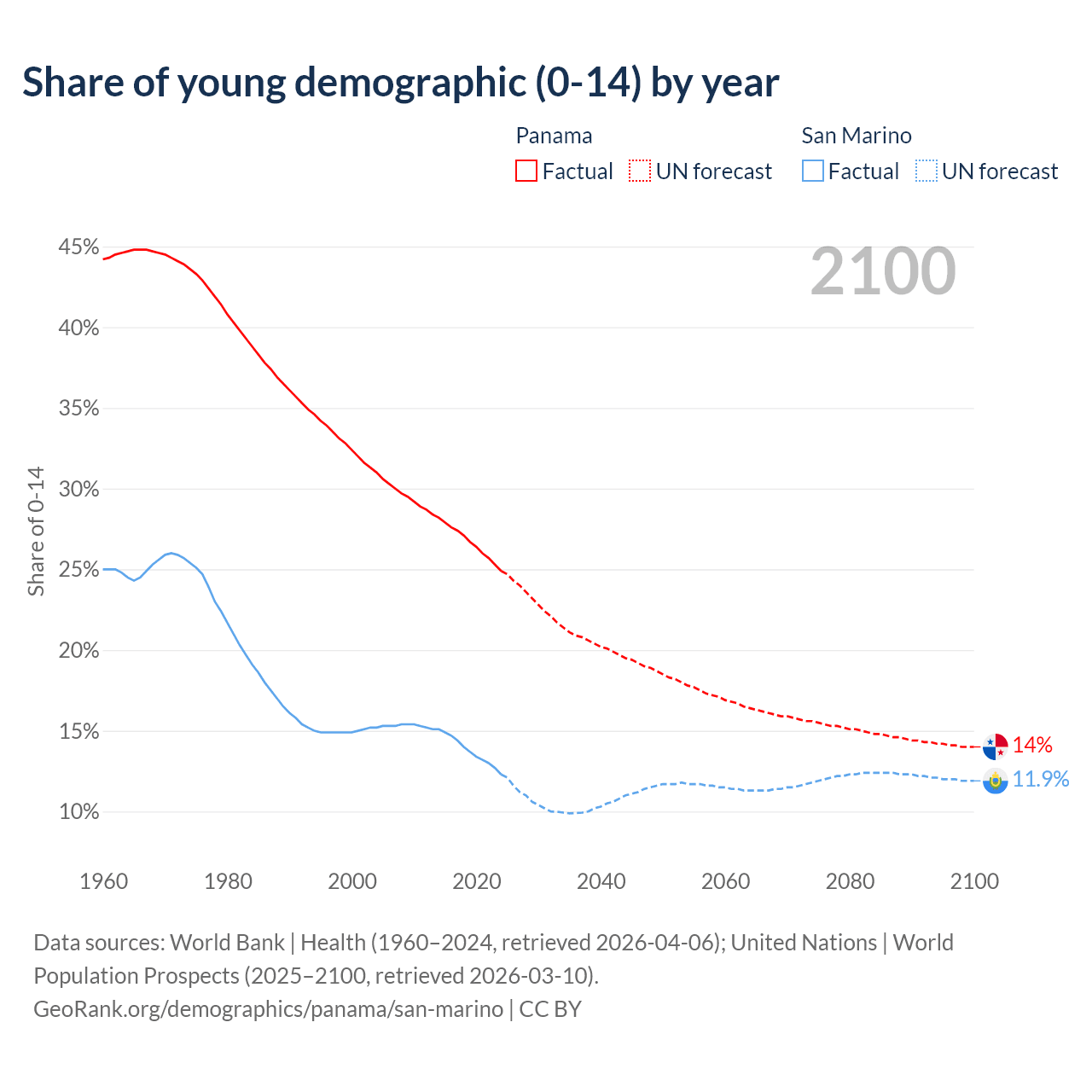 - The share of young demographic (0-15 years old) in Panama is 24.9% vs 12.3% in San Marino.