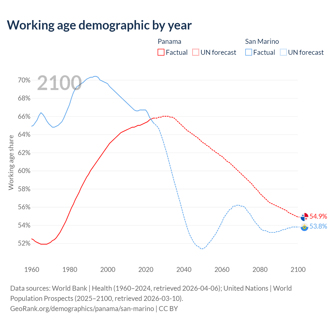 - Panama has 3.05M working age adults (aged 15-64) vs 22.2K in San Marino.
