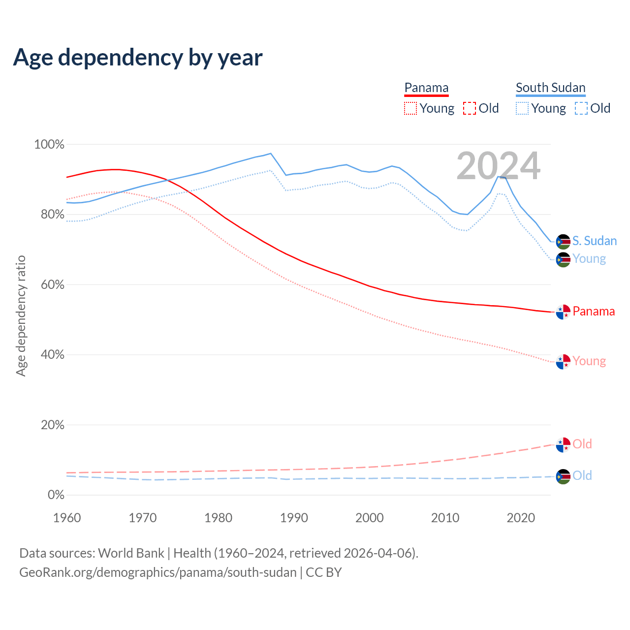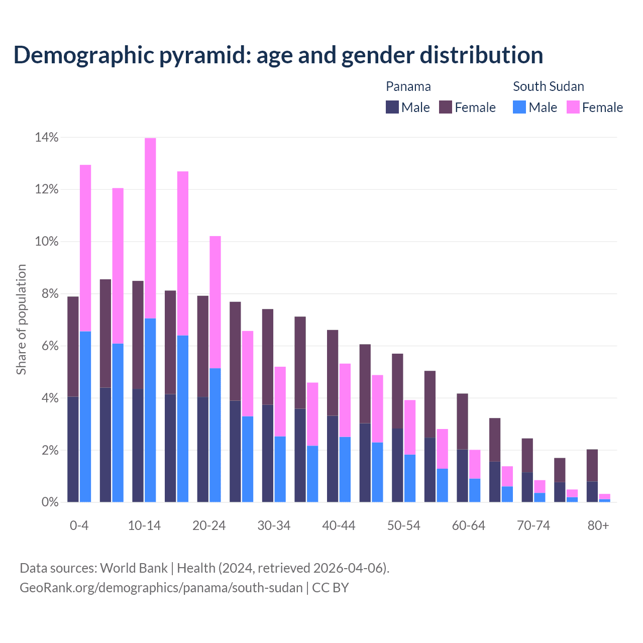 - Panama is ranked 94/196 by median age (oldest to youngest) vs 173/196 for South Sudan.