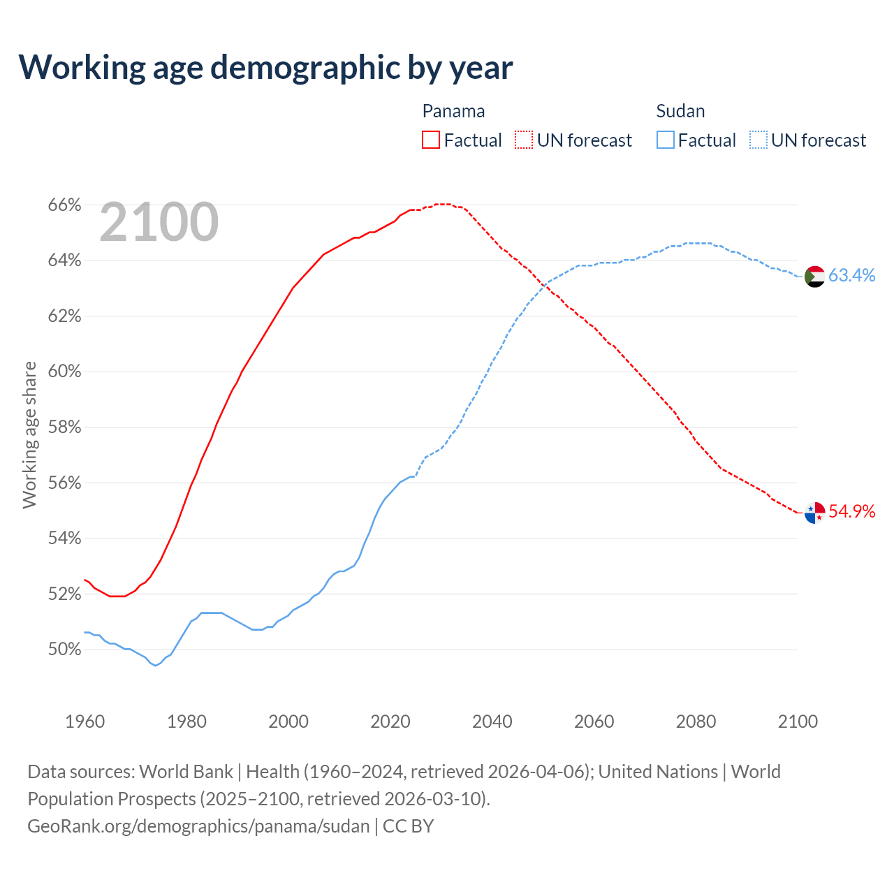 Median age Panama vs Sudan, 1960-2100