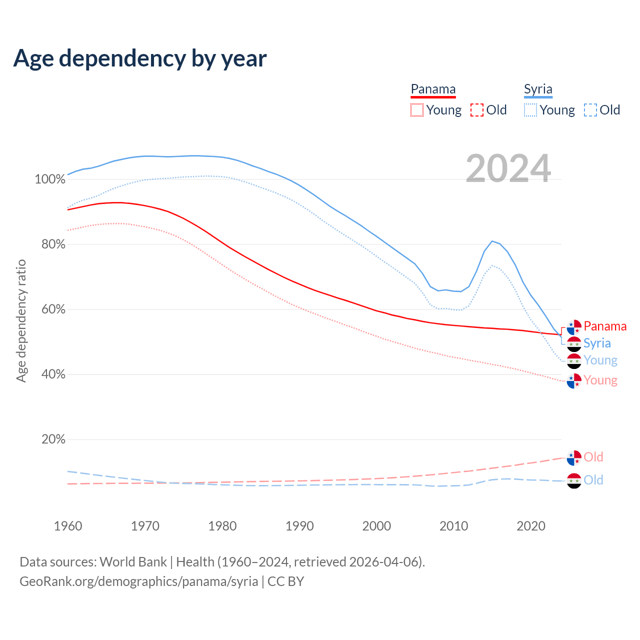- Panama is ranked 94/196 by median age (oldest to youngest) vs 138/196 for Syria.