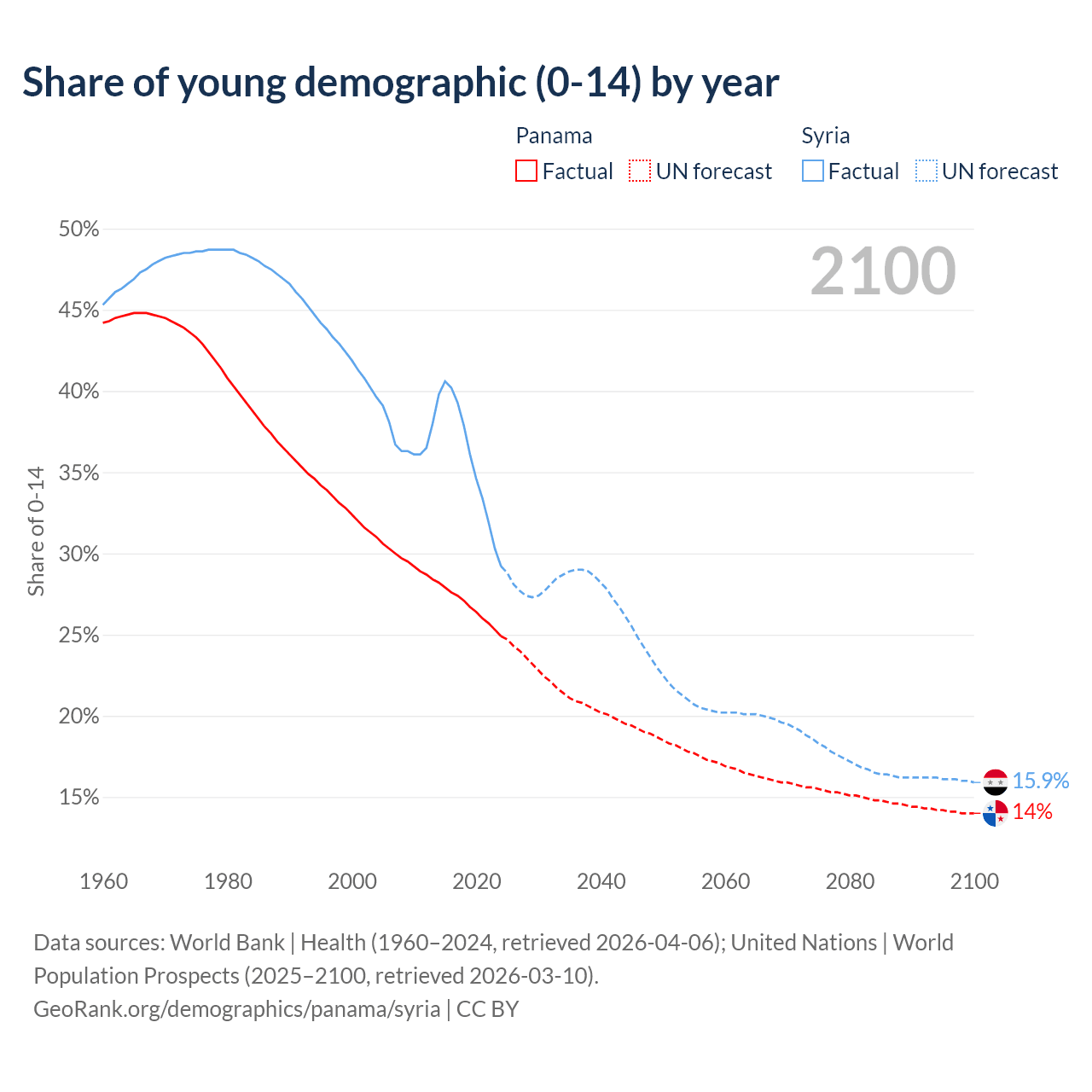 - The share of young demographic (0-15 years old) in Panama is 24.9% vs 29.2% in Syria.