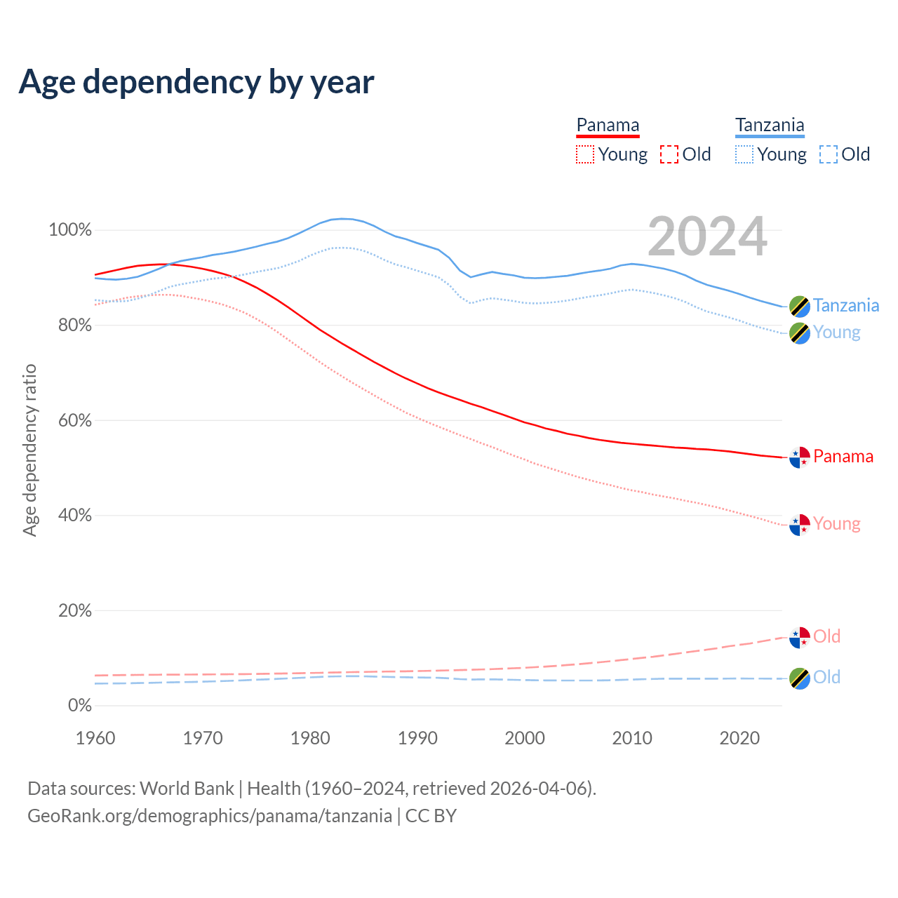 - The share of old-age demographic (65+) in Panama is 9.35% vs 3.05% in Tanzania.