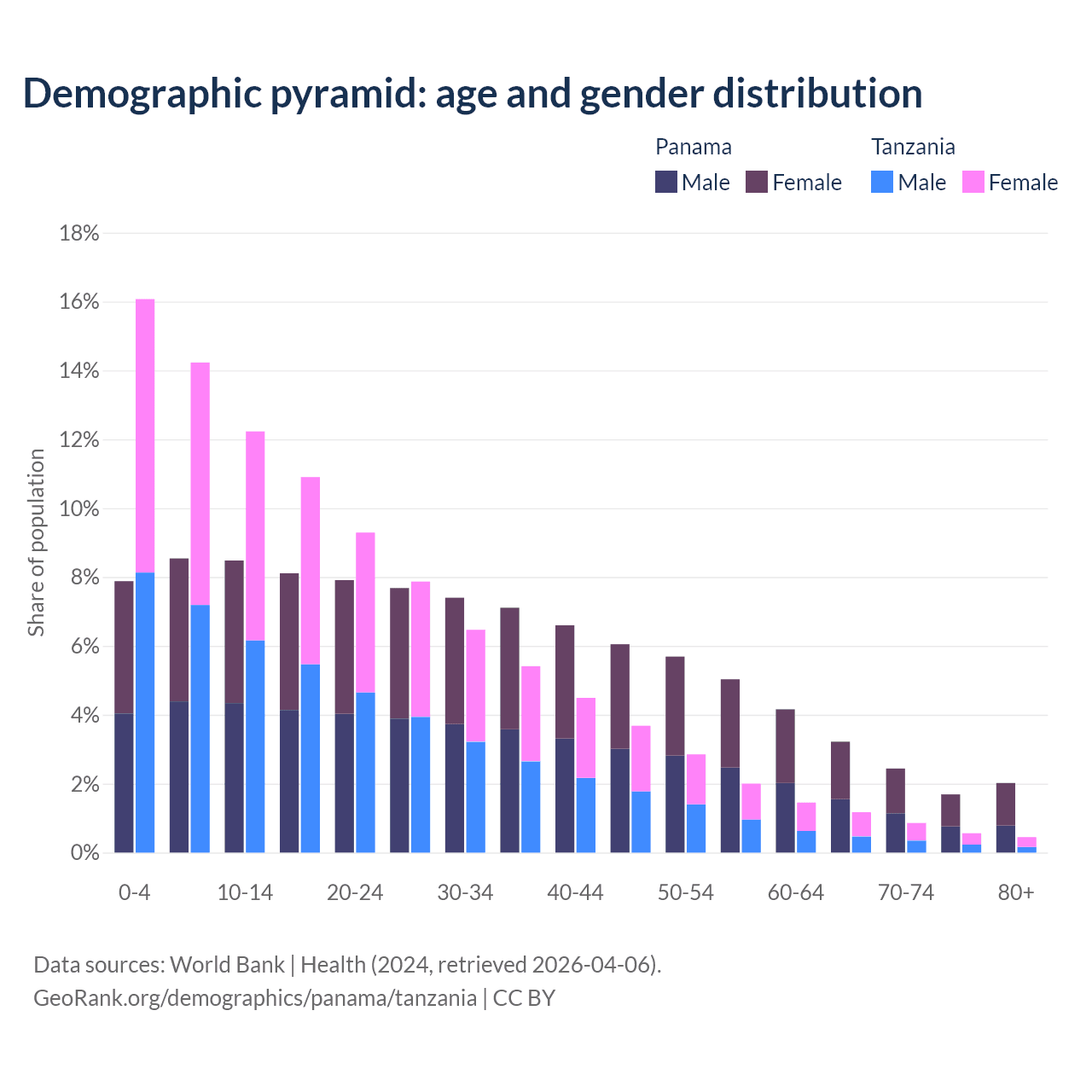 - Panama is ranked 94/196 by median age (oldest to youngest) vs 184/196 for Tanzania.