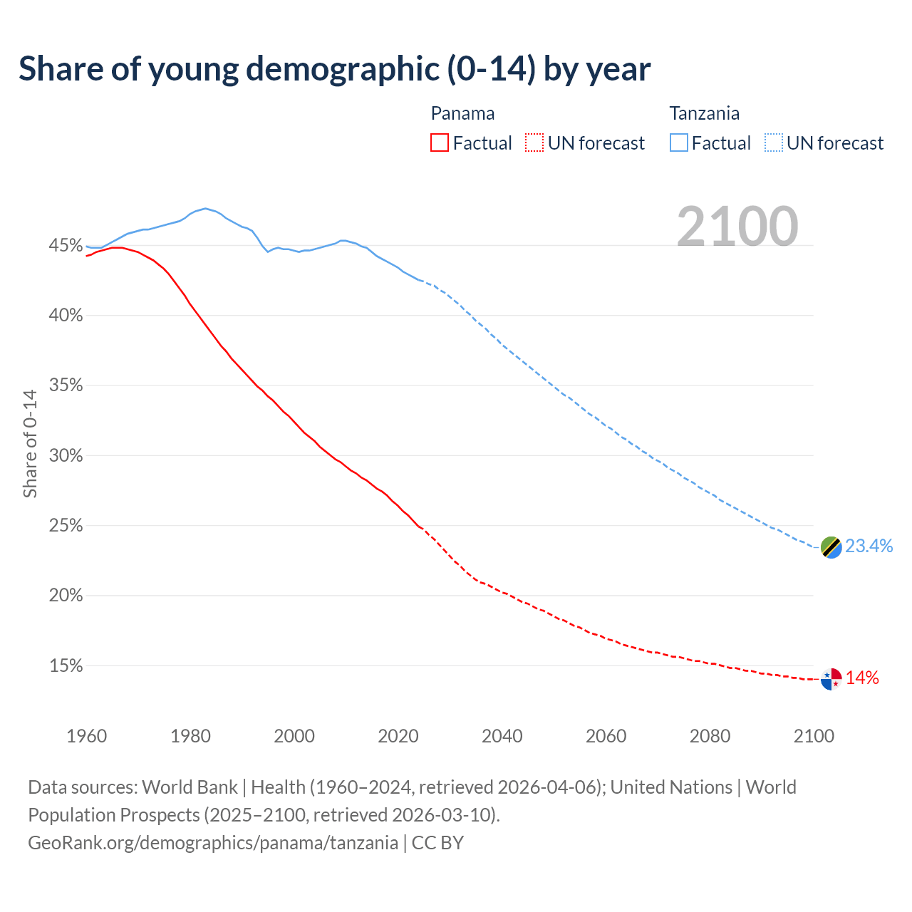 - The share of young demographic (0-15 years old) in Panama is 24.9% vs 42.5% in Tanzania.