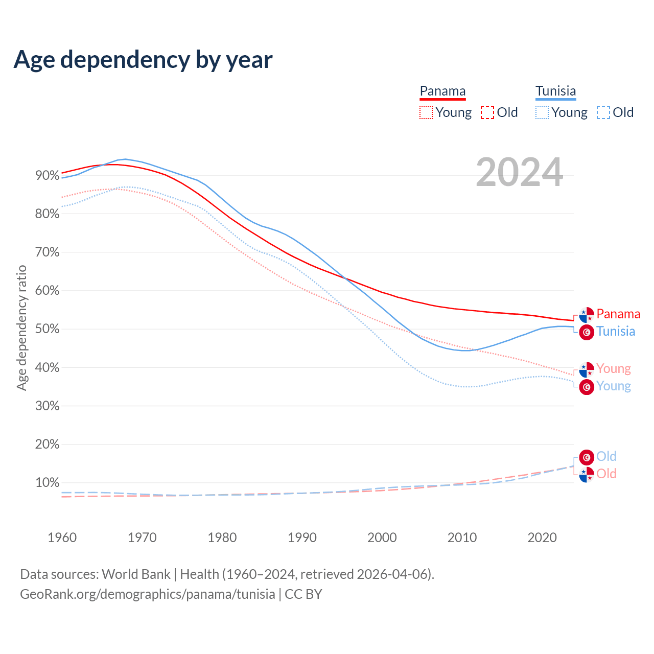 - The share of old-age demographic (65+) in Panama is 9.35% vs 9.53% in Tunisia.