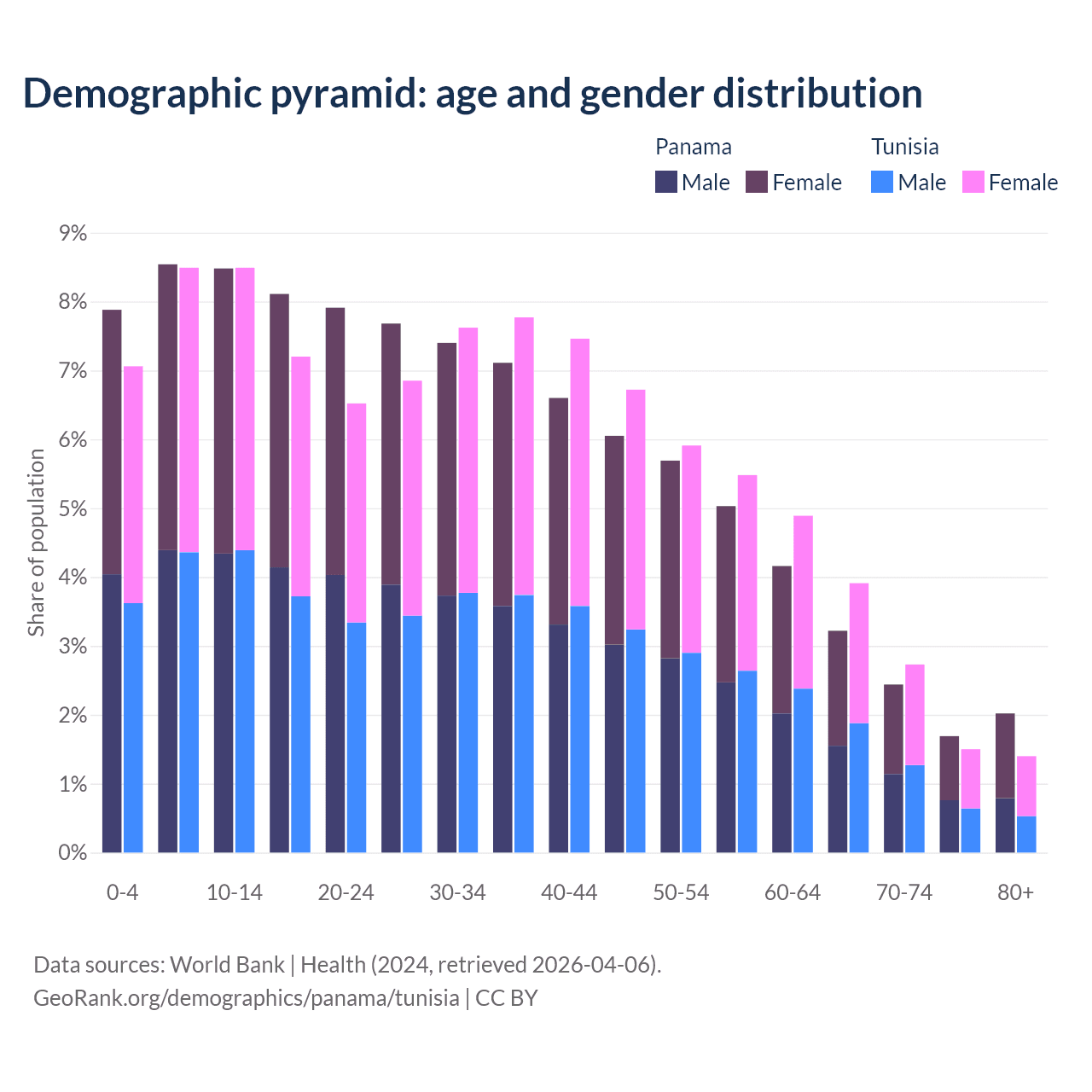 - Panama is ranked 94/196 by median age (oldest to youngest) vs 86/196 for Tunisia.