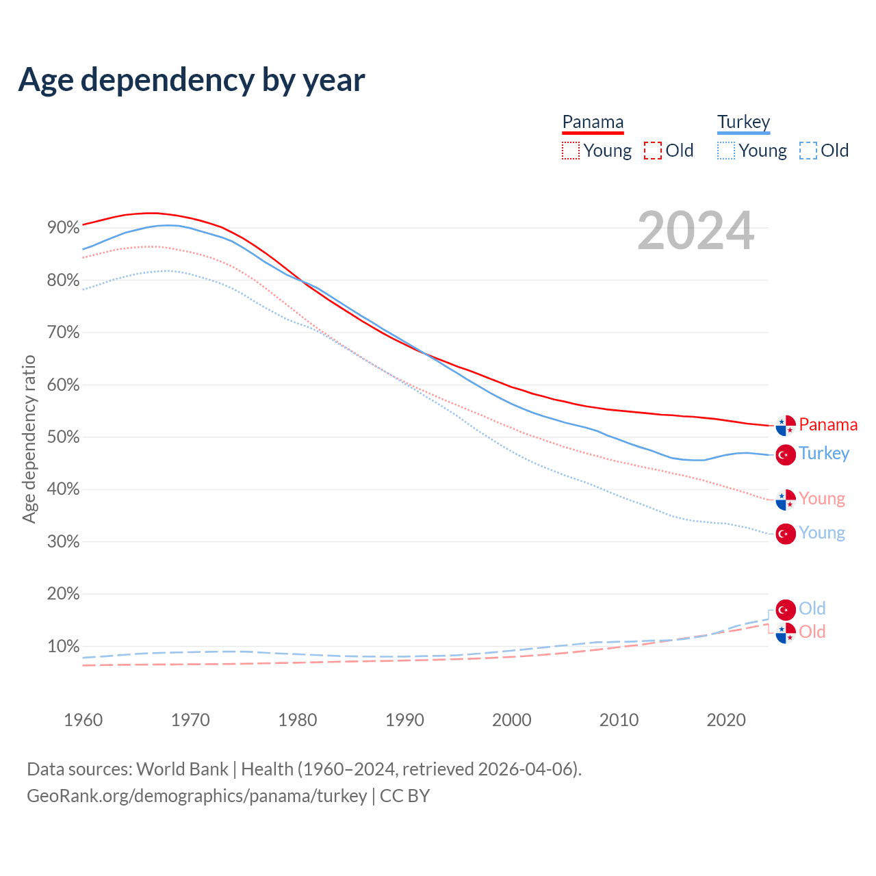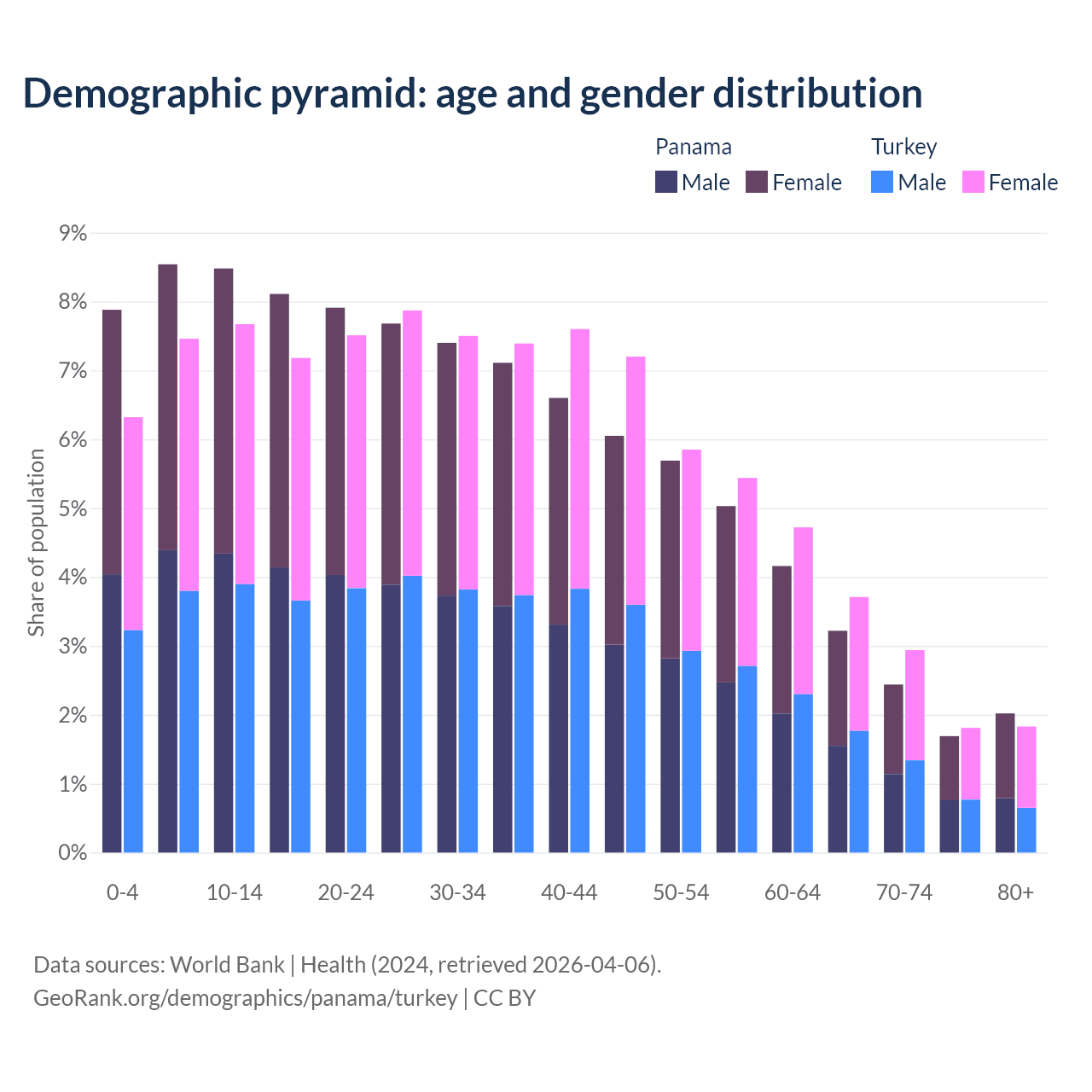 - Panama is ranked 94/196 by median age (oldest to youngest) vs 83/196 for Turkey.