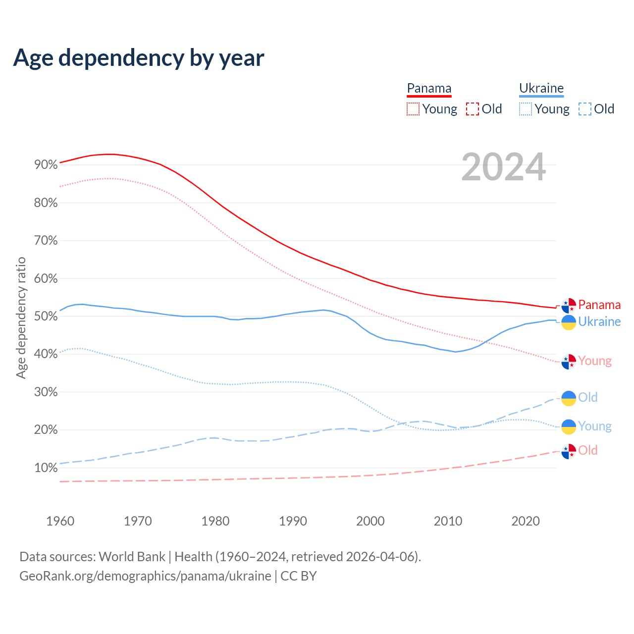 - Panama is ranked 94/196 by median age (oldest to youngest) vs 26/196 for Ukraine.