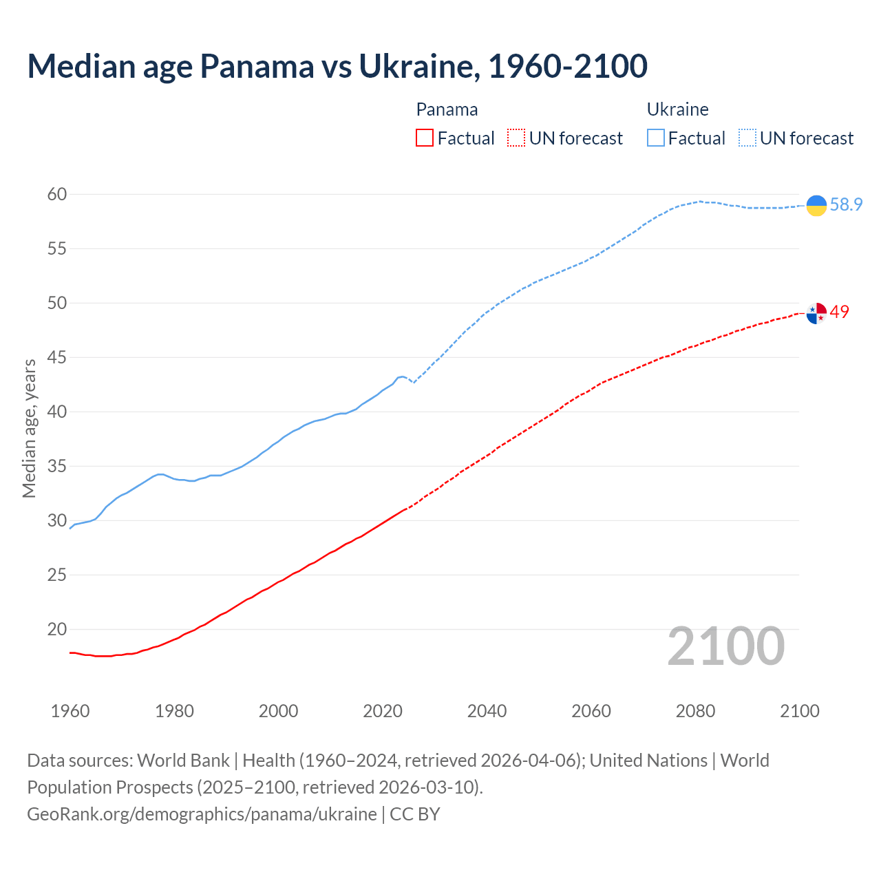 Median age Panama vs Ukraine, 1960-2100