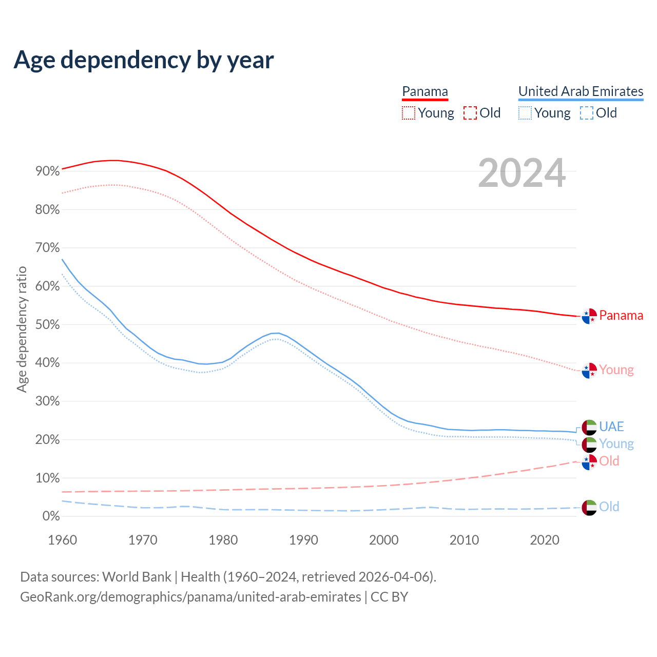 Data sources: World Bank | Health (1960–2024, retrieved 2026-04-06); U.S. Census Bureau (1960–2024, retrieved 2026-02-08).