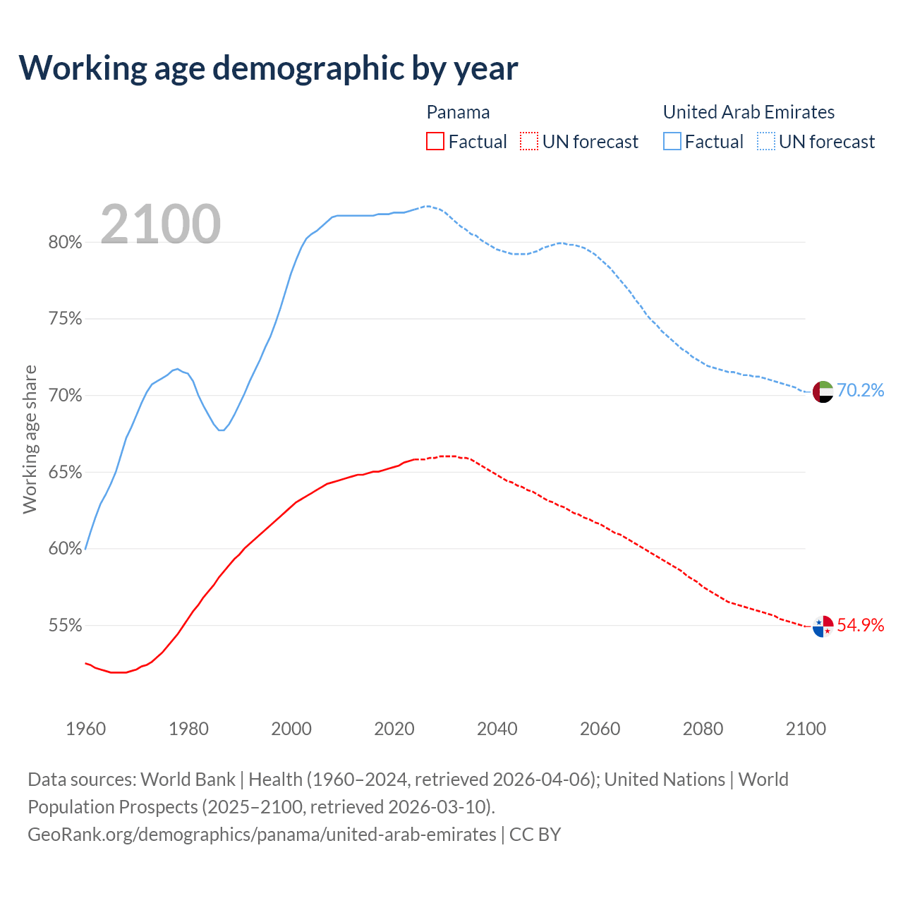 Median age Panama vs United Arab Emirates, 1960-2100