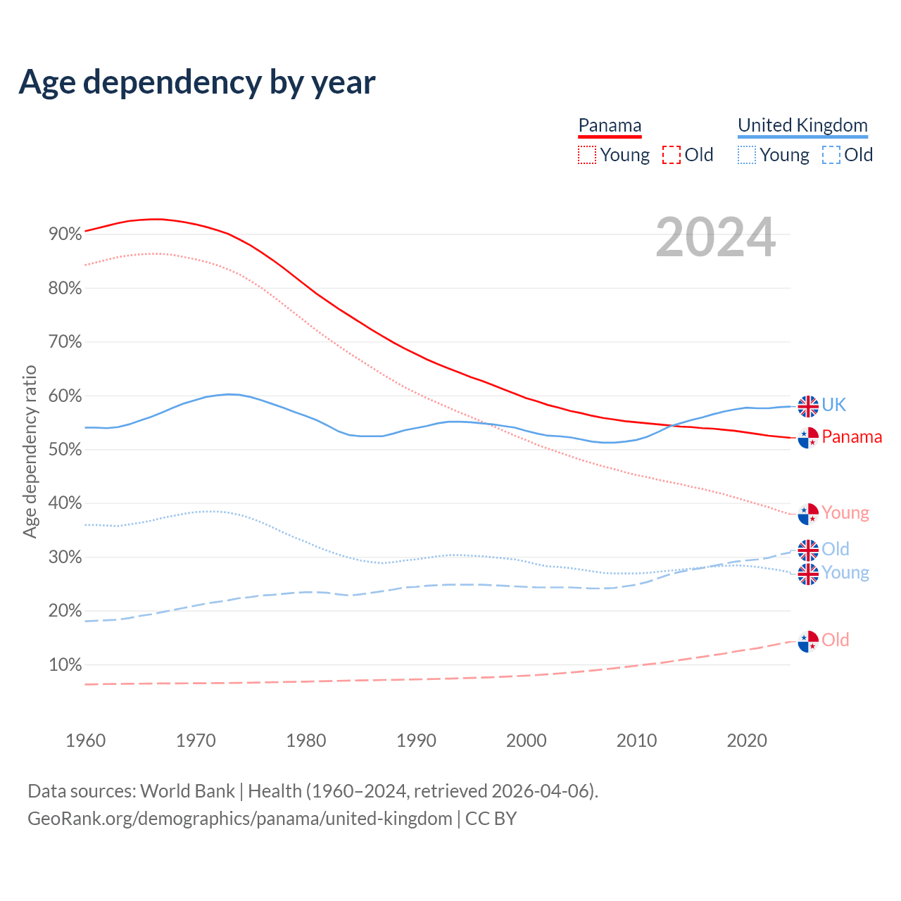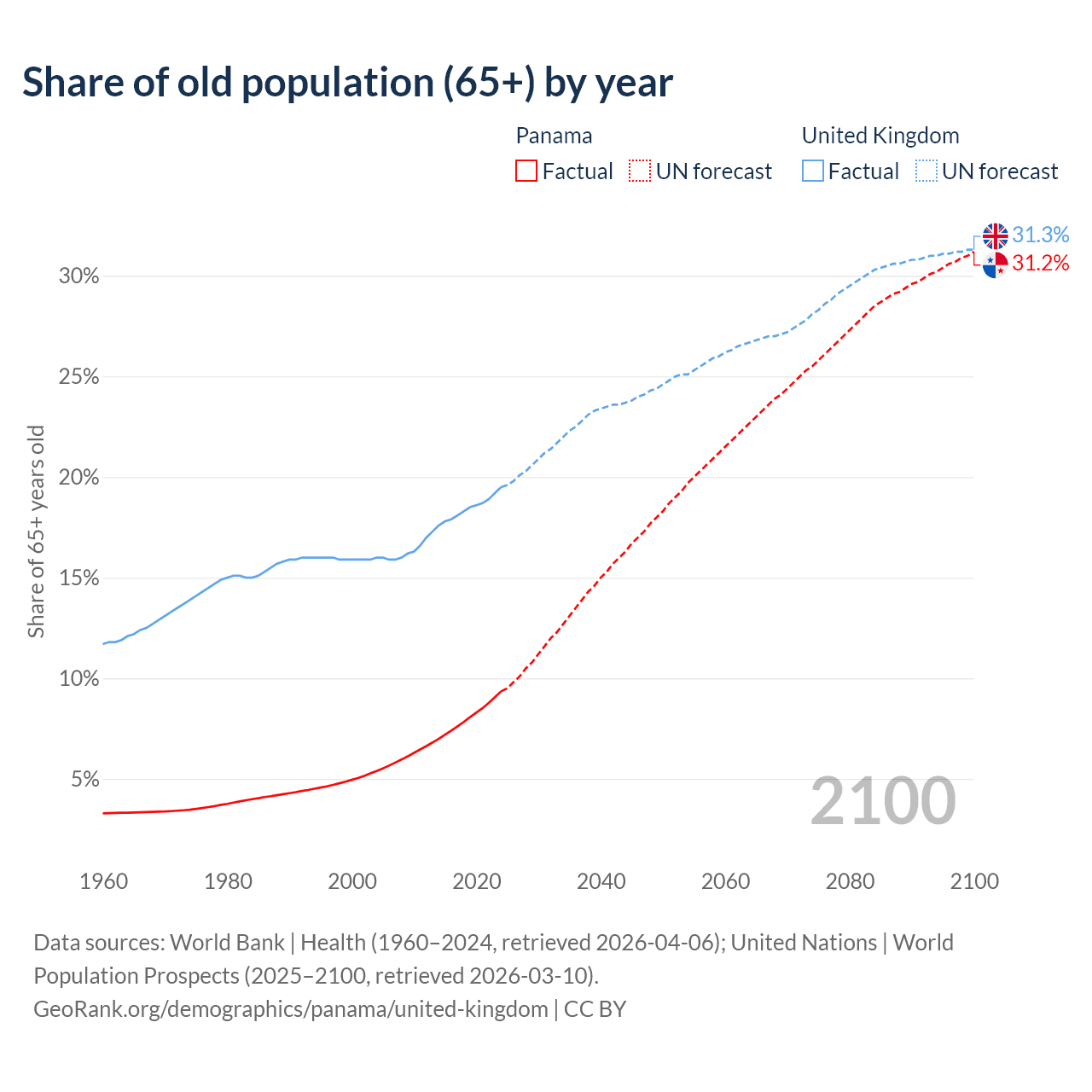 - The share of old-age demographic (65+) in Panama is 9.35% vs 19.5% in the United Kingdom.