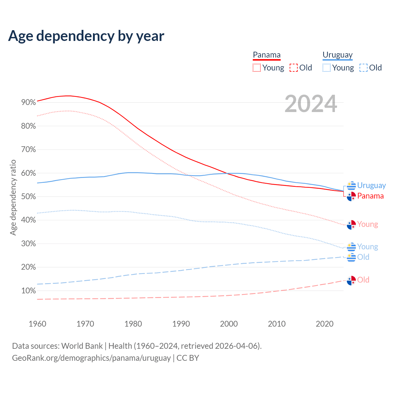 Data sources: World Bank | Health (1960–2024, retrieved 2026-04-06); U.S. Census Bureau (1960–2024, retrieved 2026-02-08).