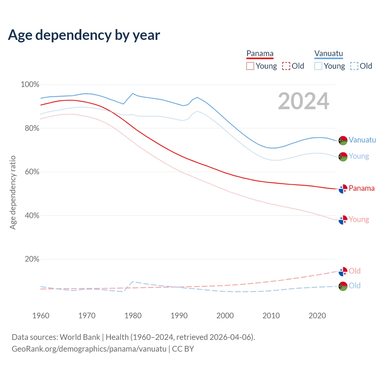 - The share of young demographic (0-15 years old) in Panama is 24.9% vs 38.3% in Vanuatu.