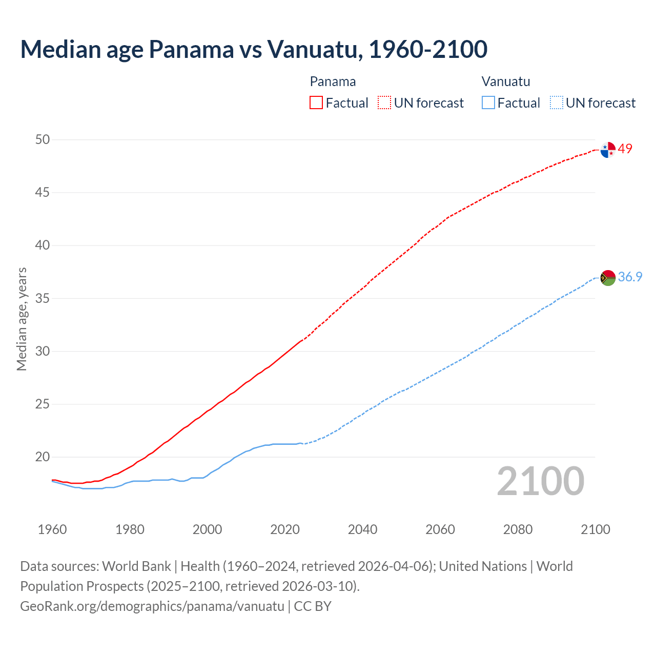 - Panama is ranked 94/196 by median age (oldest to youngest) vs 156/196 for Vanuatu.