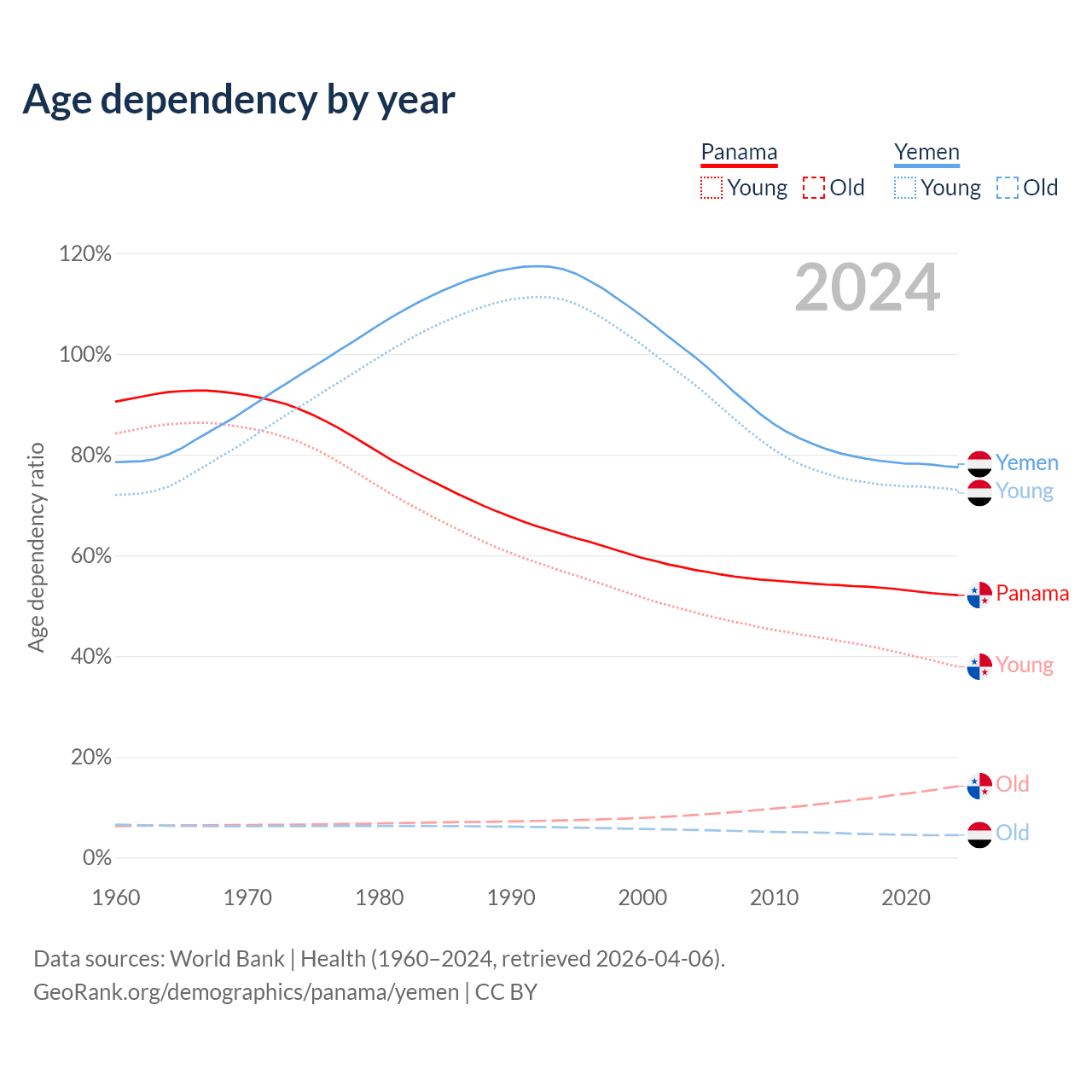 - The share of old-age demographic (65+) in Panama is 9.35% vs 2.52% in Yemen.