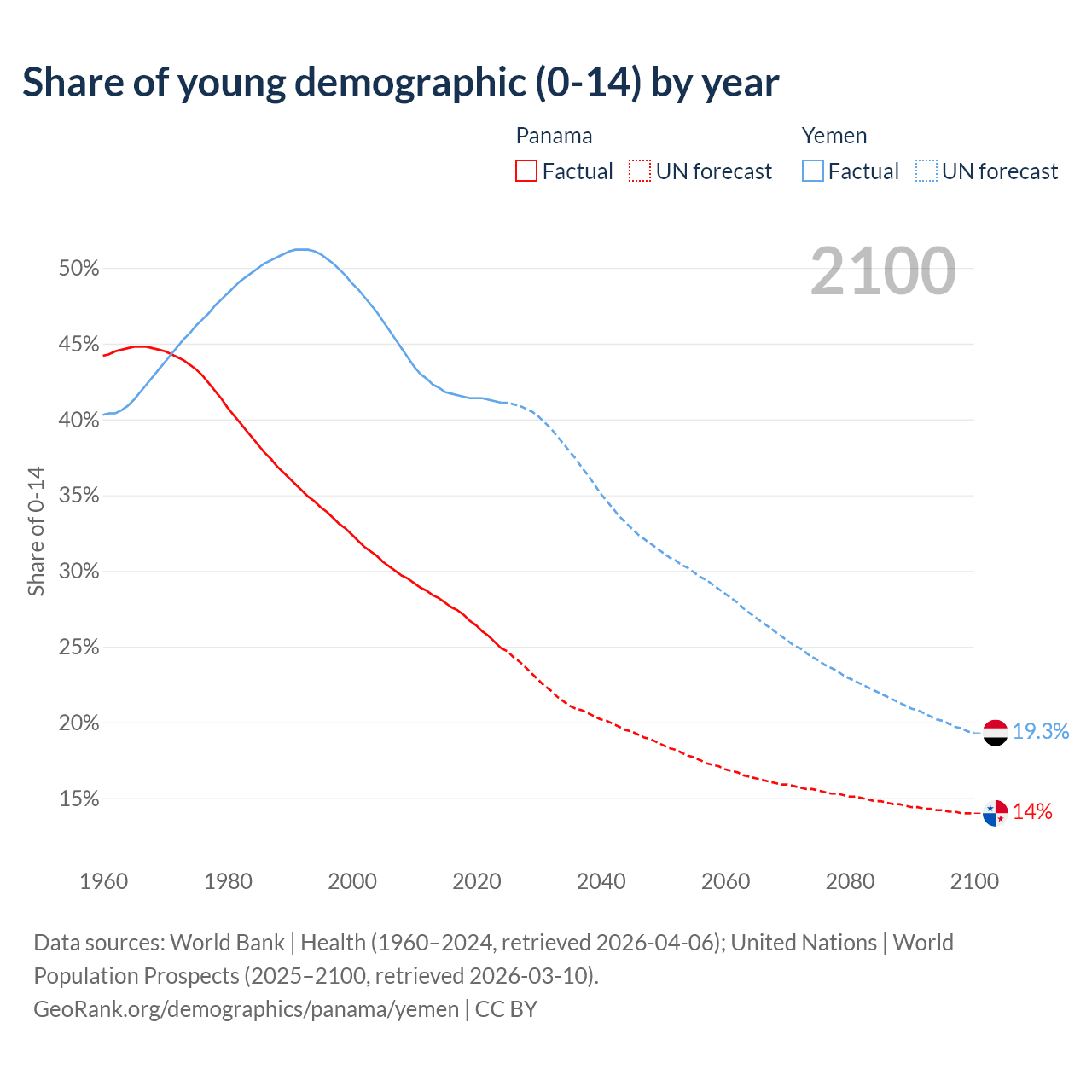 - The share of young demographic (0-15 years old) in Panama is 24.9% vs 41.1% in Yemen.