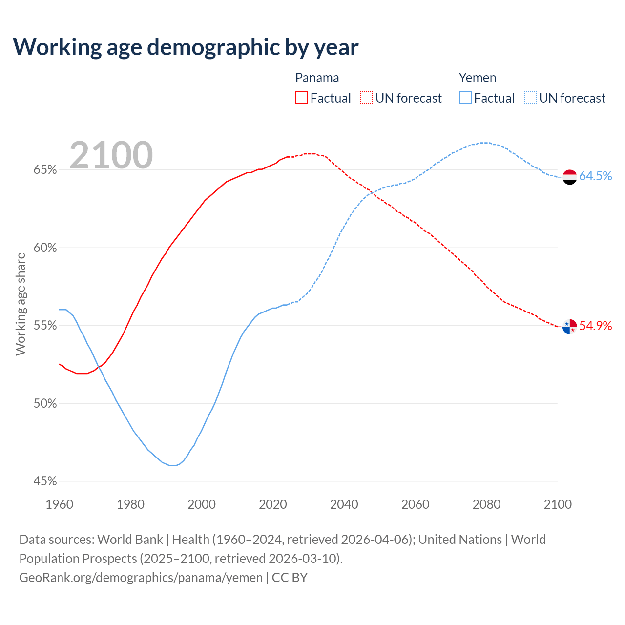 Median age Panama vs Yemen, 1960-2100