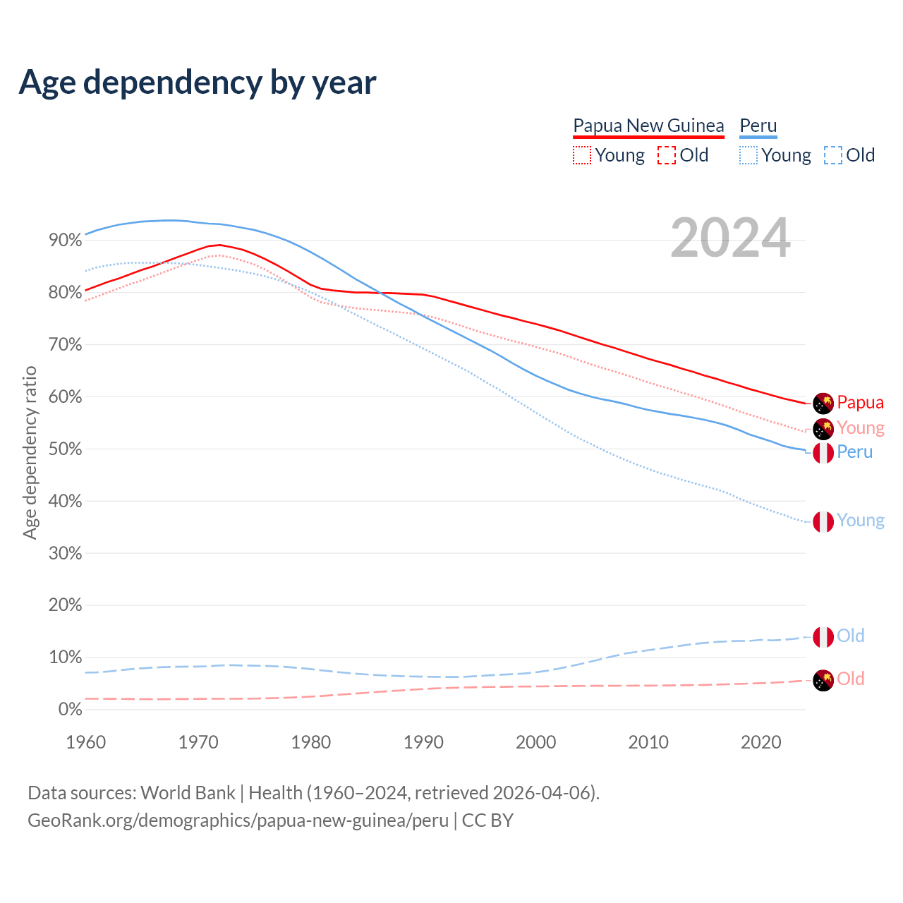 - Papua New Guinea is ranked 140/196 by median age (oldest to youngest) vs 97/196 for Peru.