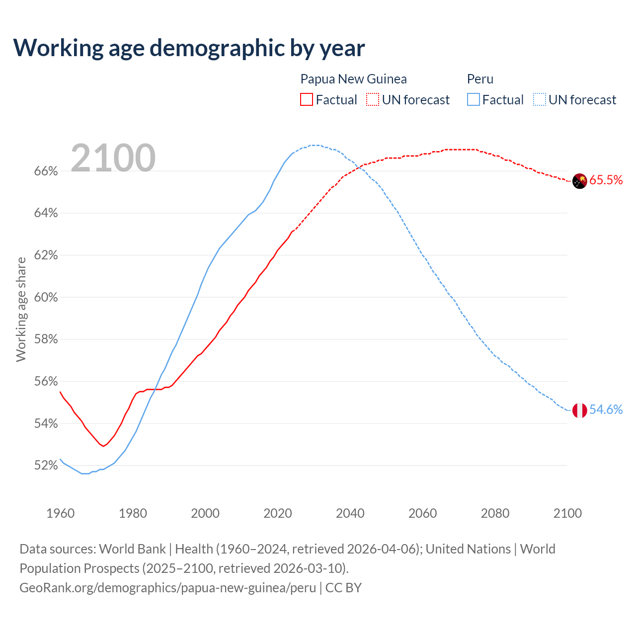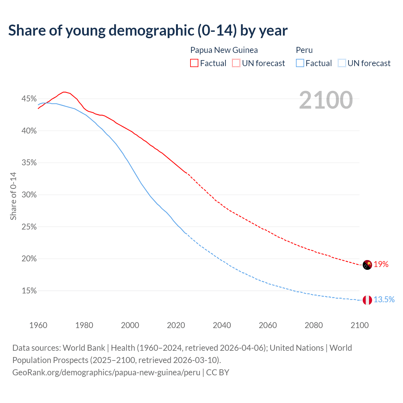 Median age Papua New Guinea vs Peru, 1960-2100