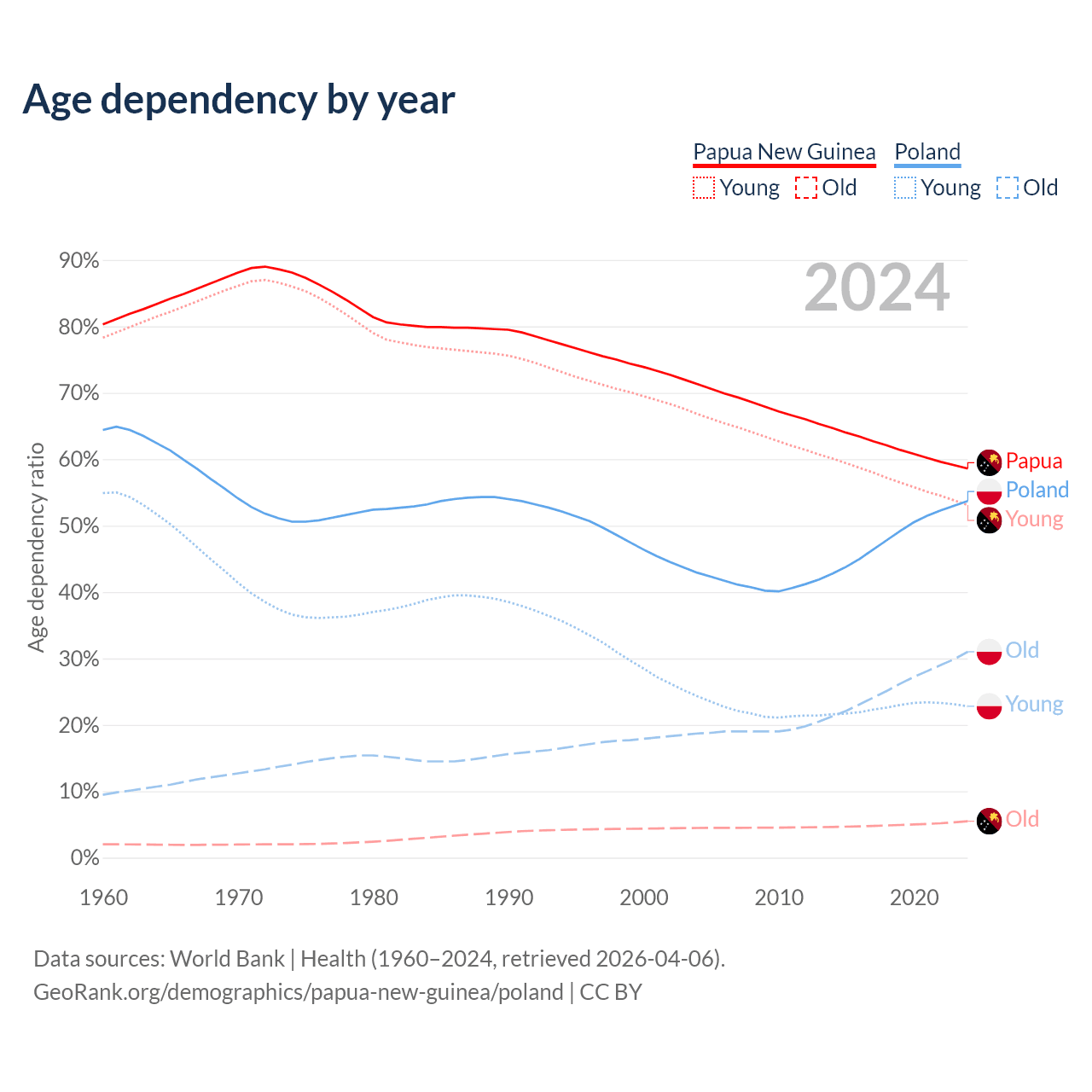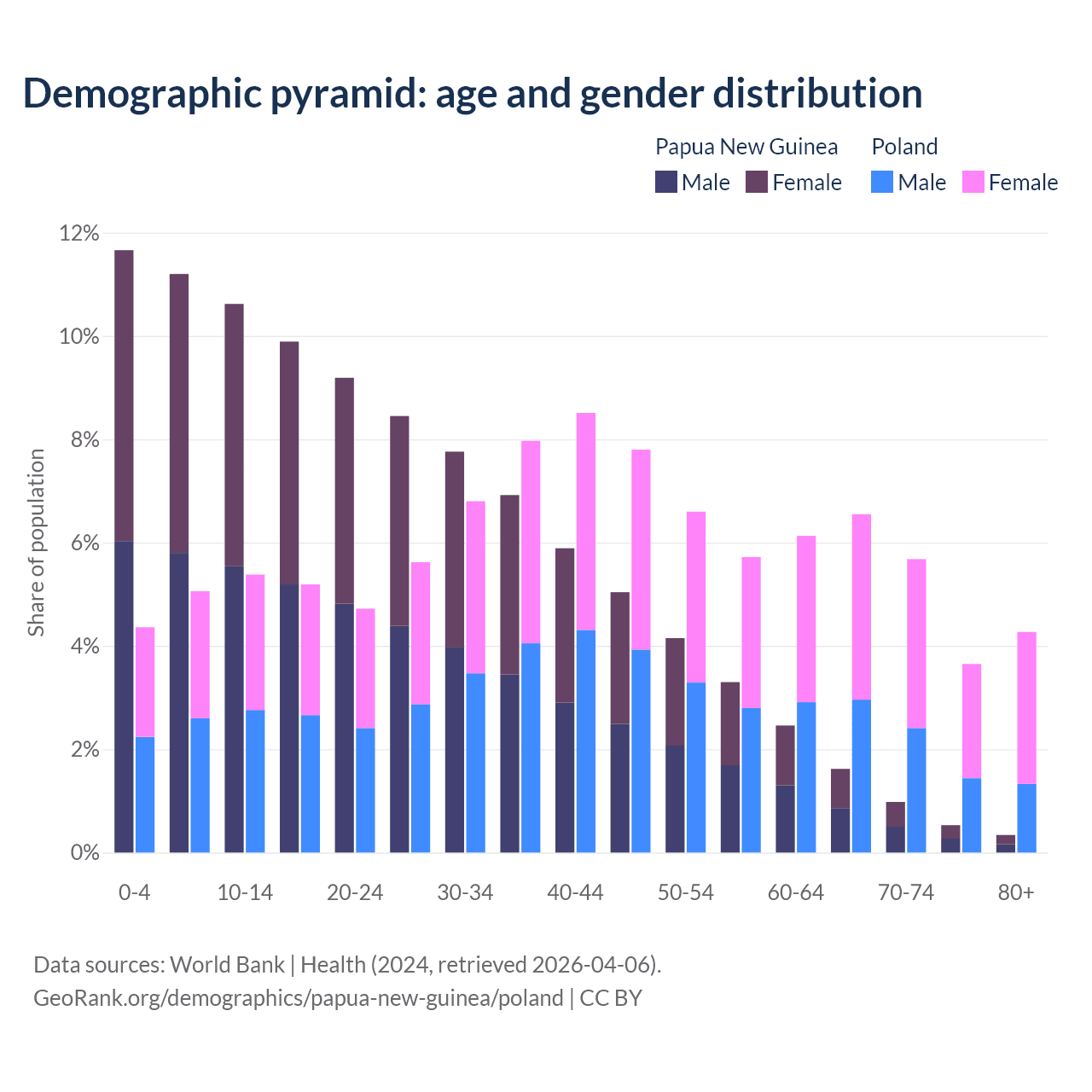 - The share of old-age demographic (65+) in Papua New Guinea is 3.46% vs 20.1% in Poland.