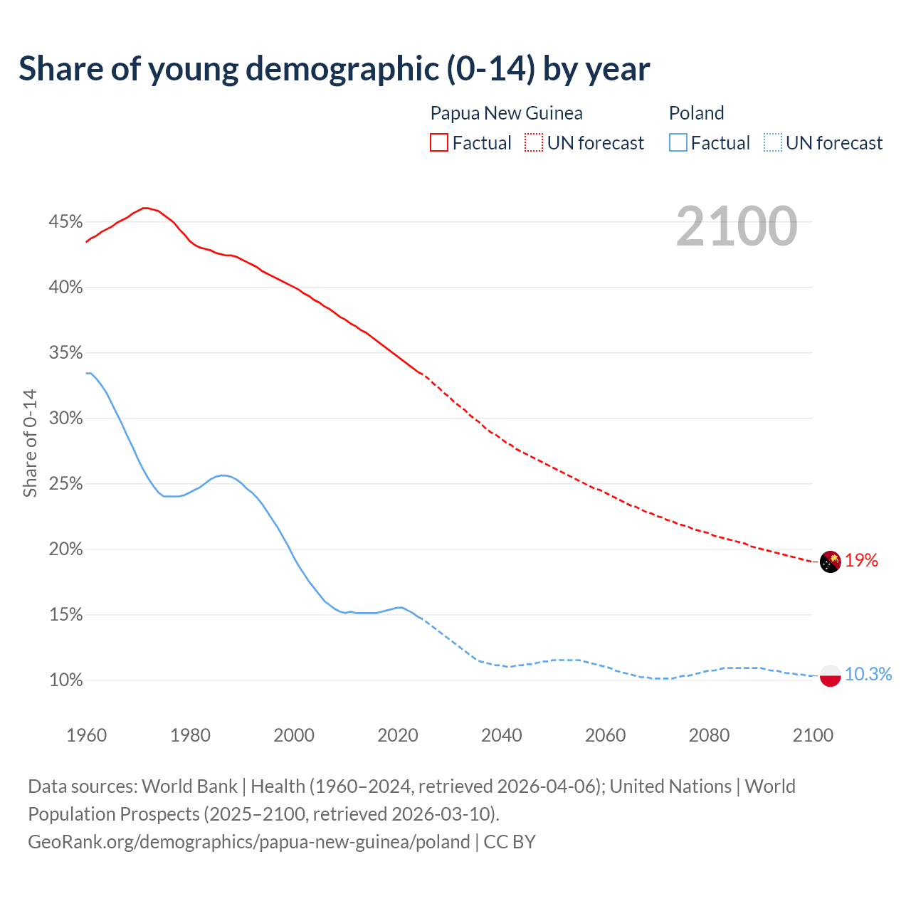 - The share of young demographic (0-15 years old) in Papua New Guinea is 33.5% vs 14.8% in Poland.