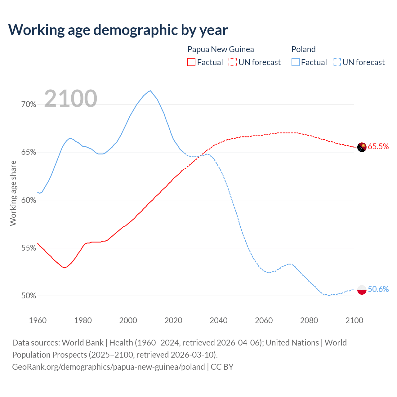 The share of older people aged 65 and over is 3.46% in Papua New Guinea and 20.1% in Poland. Life expectancy in Papua New Guinea compared to Poland .
