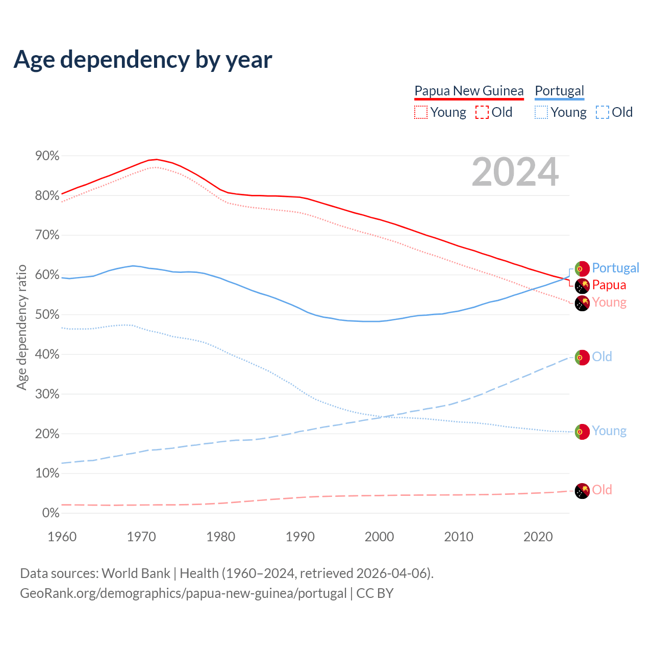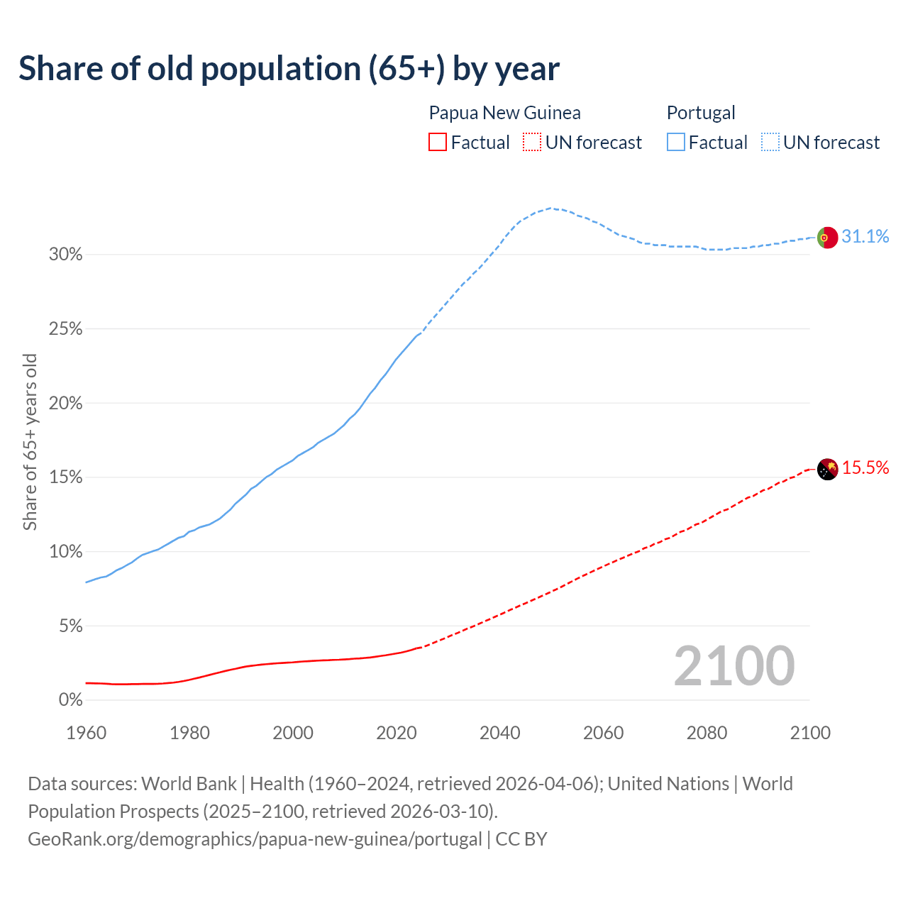 - The share of old-age demographic (65+) in Papua New Guinea is 3.46% vs 24.5% in Portugal.