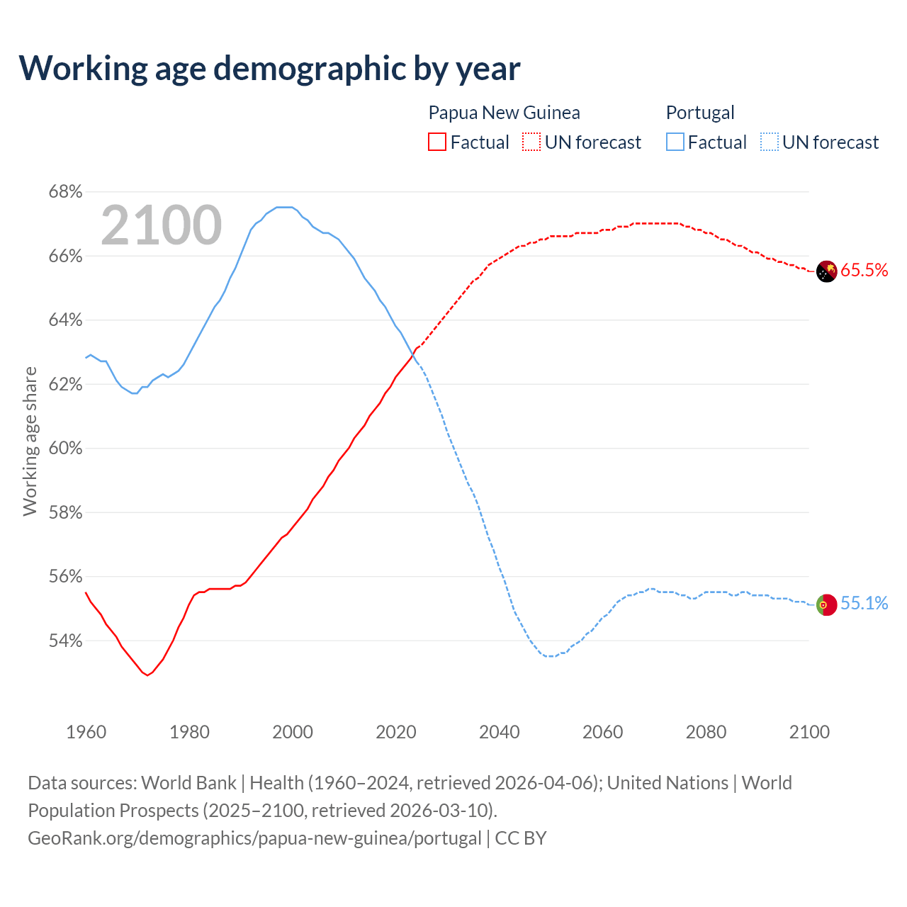 - Papua New Guinea has 6.94M working age adults (aged 15-64) vs 6.68M in Portugal.