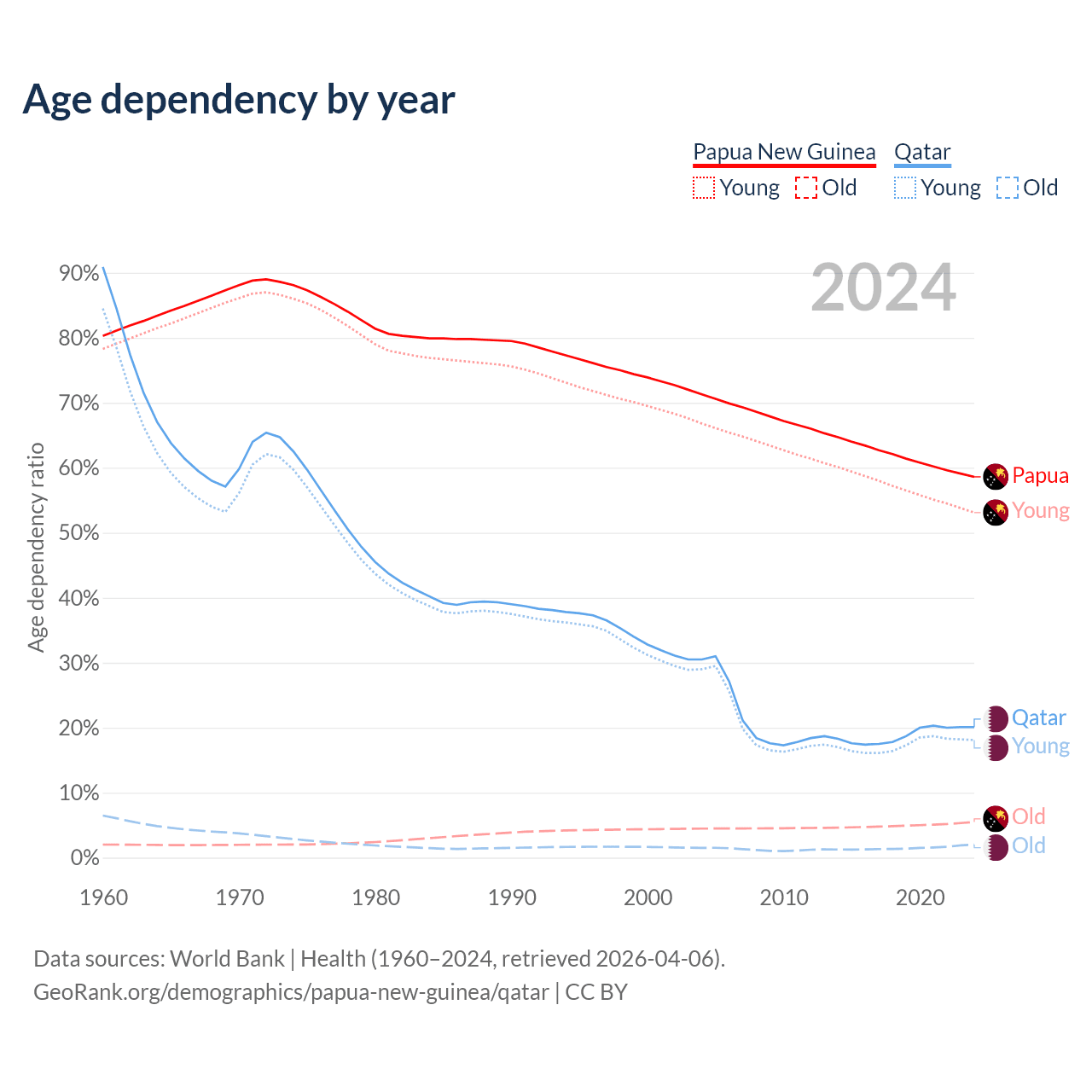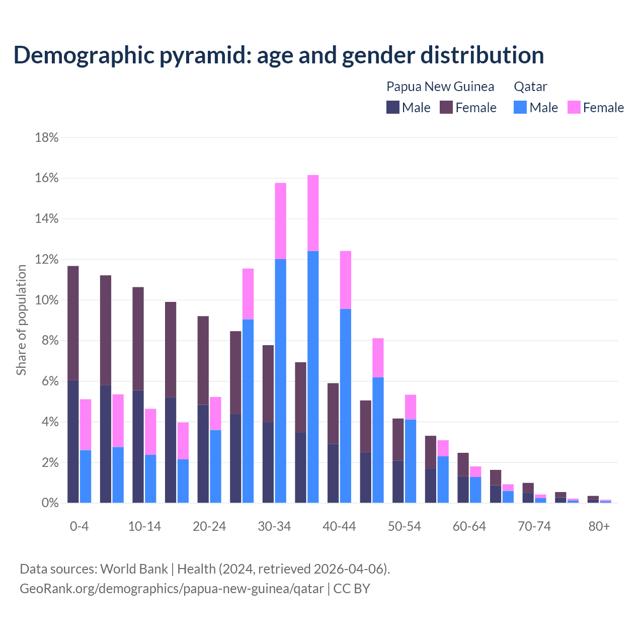 - Papua New Guinea is ranked 140/196 by median age (oldest to youngest) vs 78/196 for Qatar.