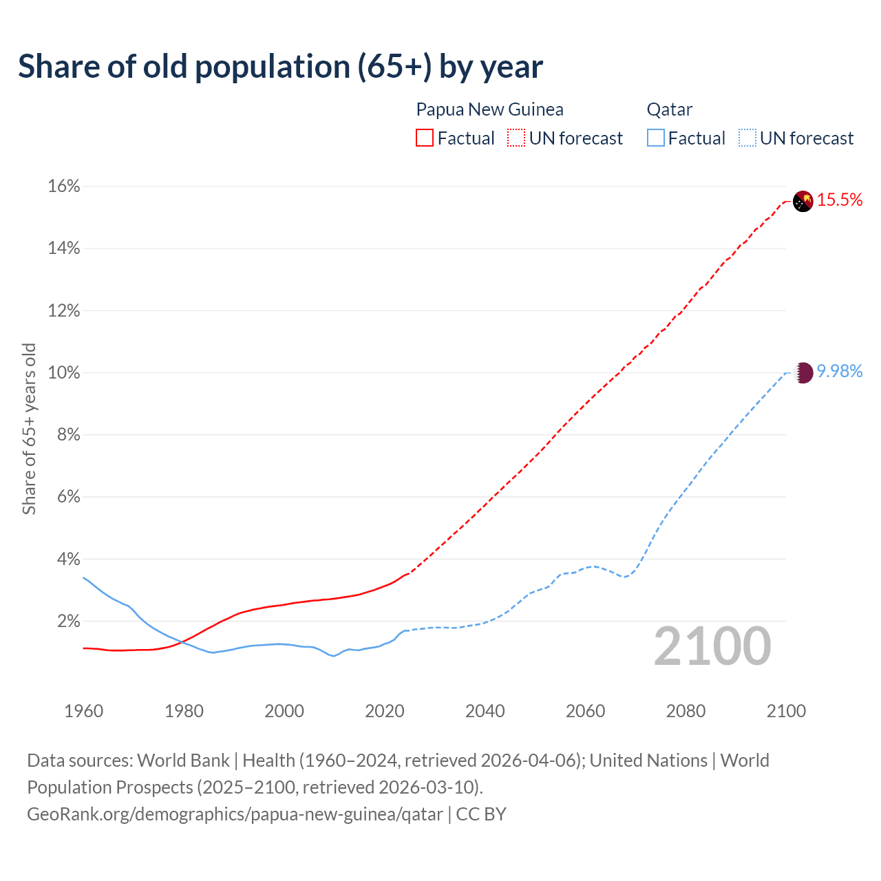 The share of older people aged 65 and over is 3.46% in Papua New Guinea and 1.68% in Qatar. Life expectancy in Papua New Guinea compared to Qatar .