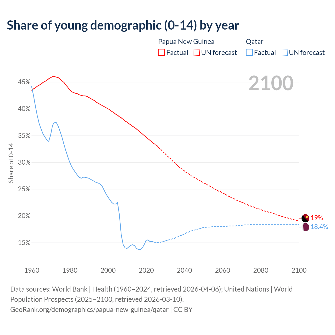 - The share of young demographic (0-15 years old) in Papua New Guinea is 33.5% vs 15.1% in Qatar.