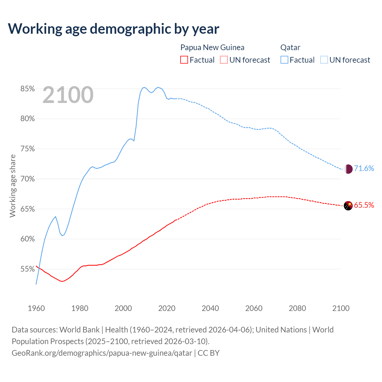 - Papua New Guinea has 6.94M working age adults (aged 15-64) vs 2.5M in Qatar.