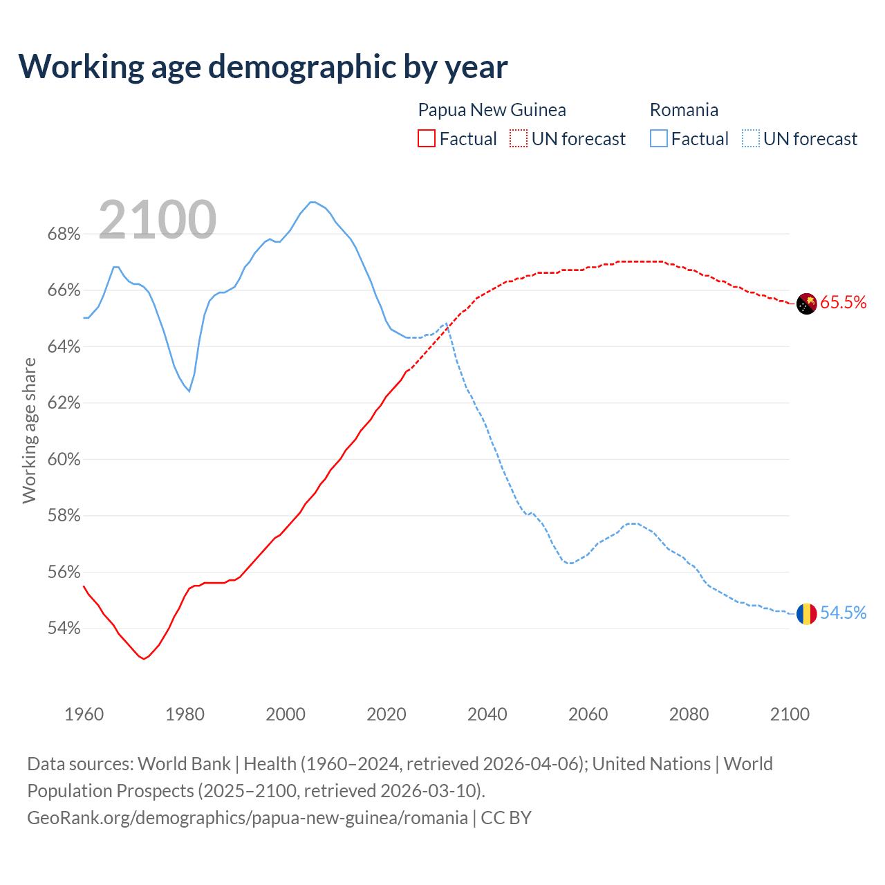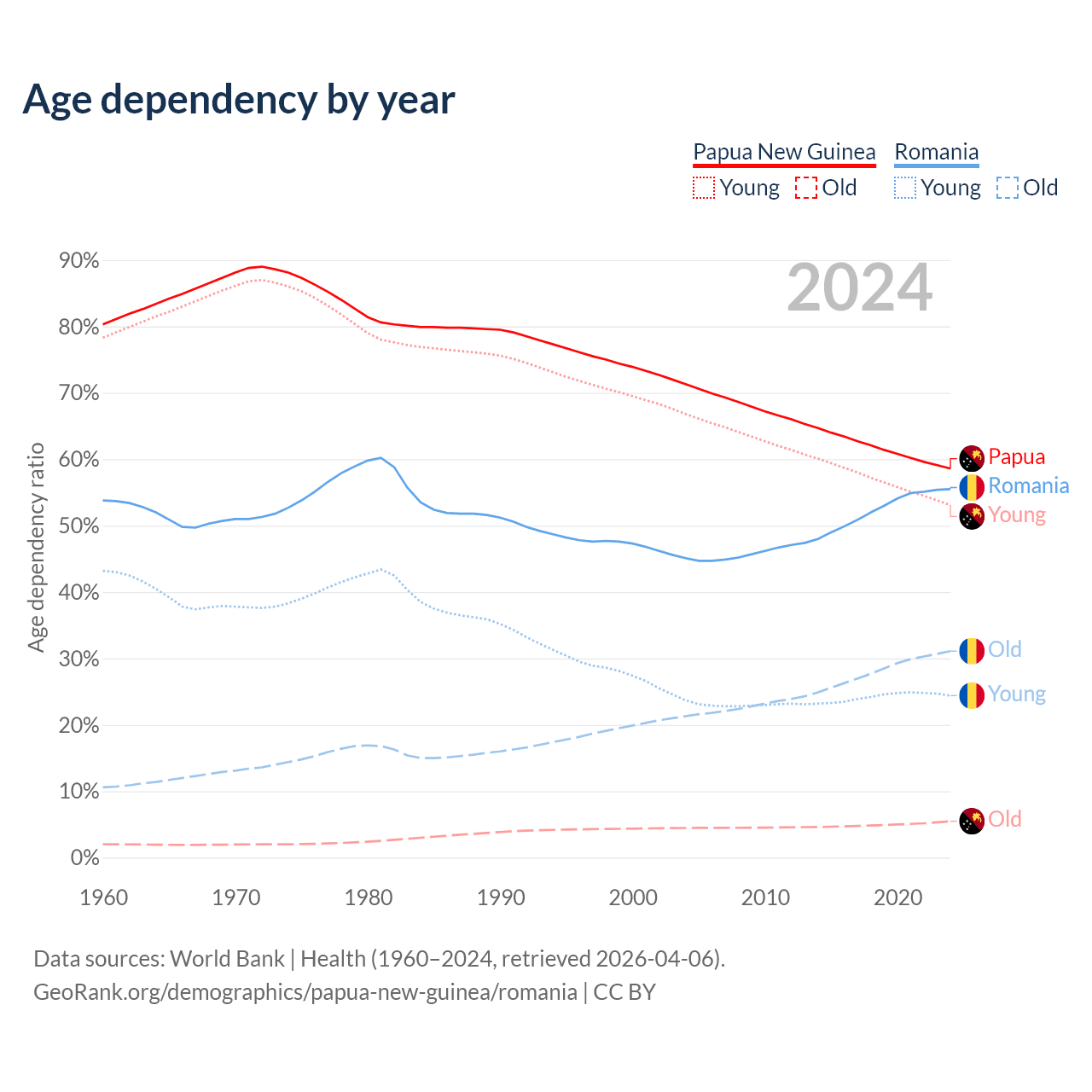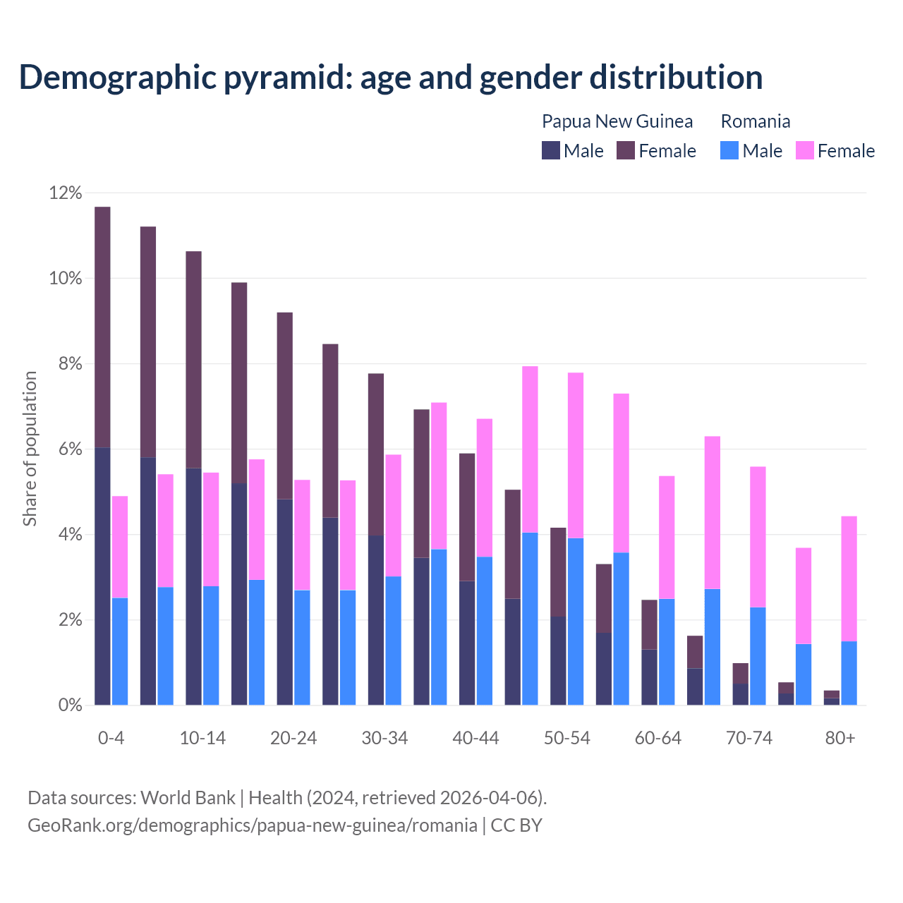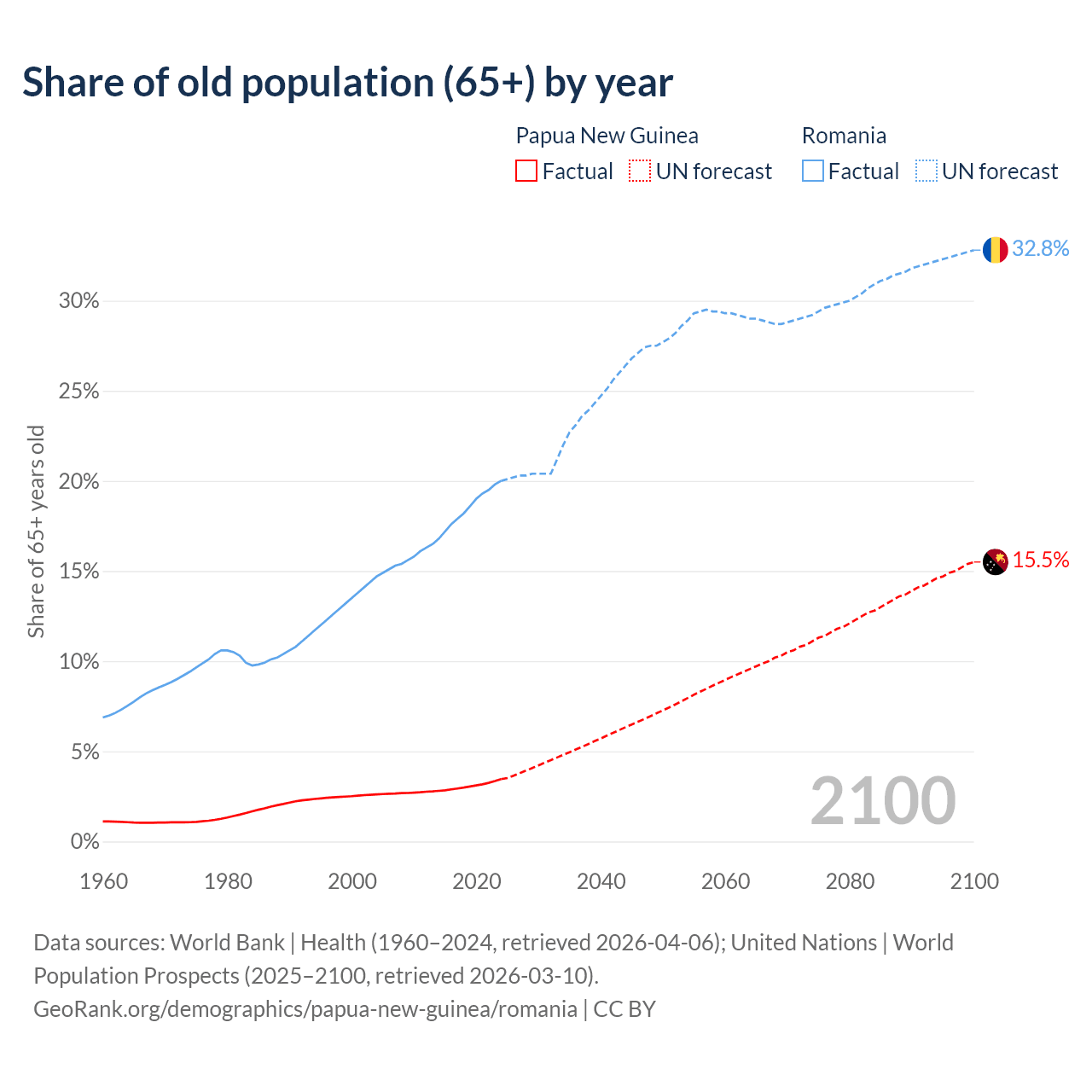 The share of older people aged 65 and over is 3.46% in Papua New Guinea and 20% in Romania. Life expectancy in Papua New Guinea compared to Romania .