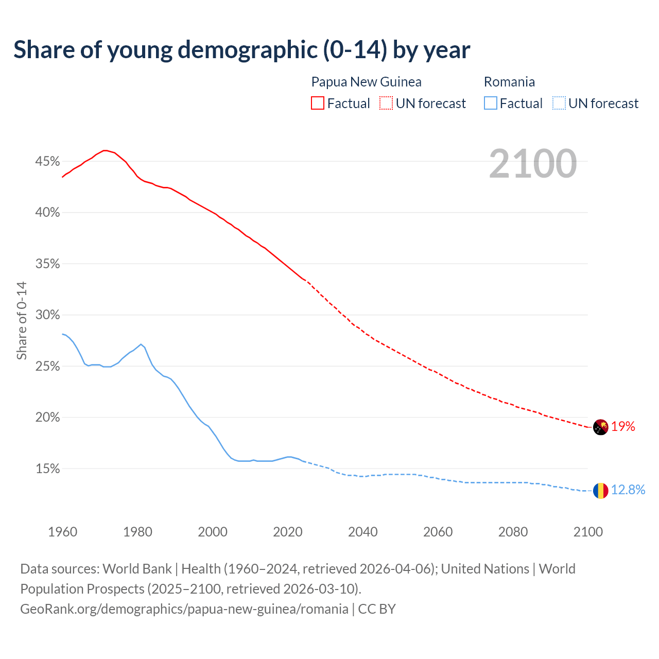- The share of young demographic (0-15 years old) in Papua New Guinea is 33.5% vs 15.7% in Romania.