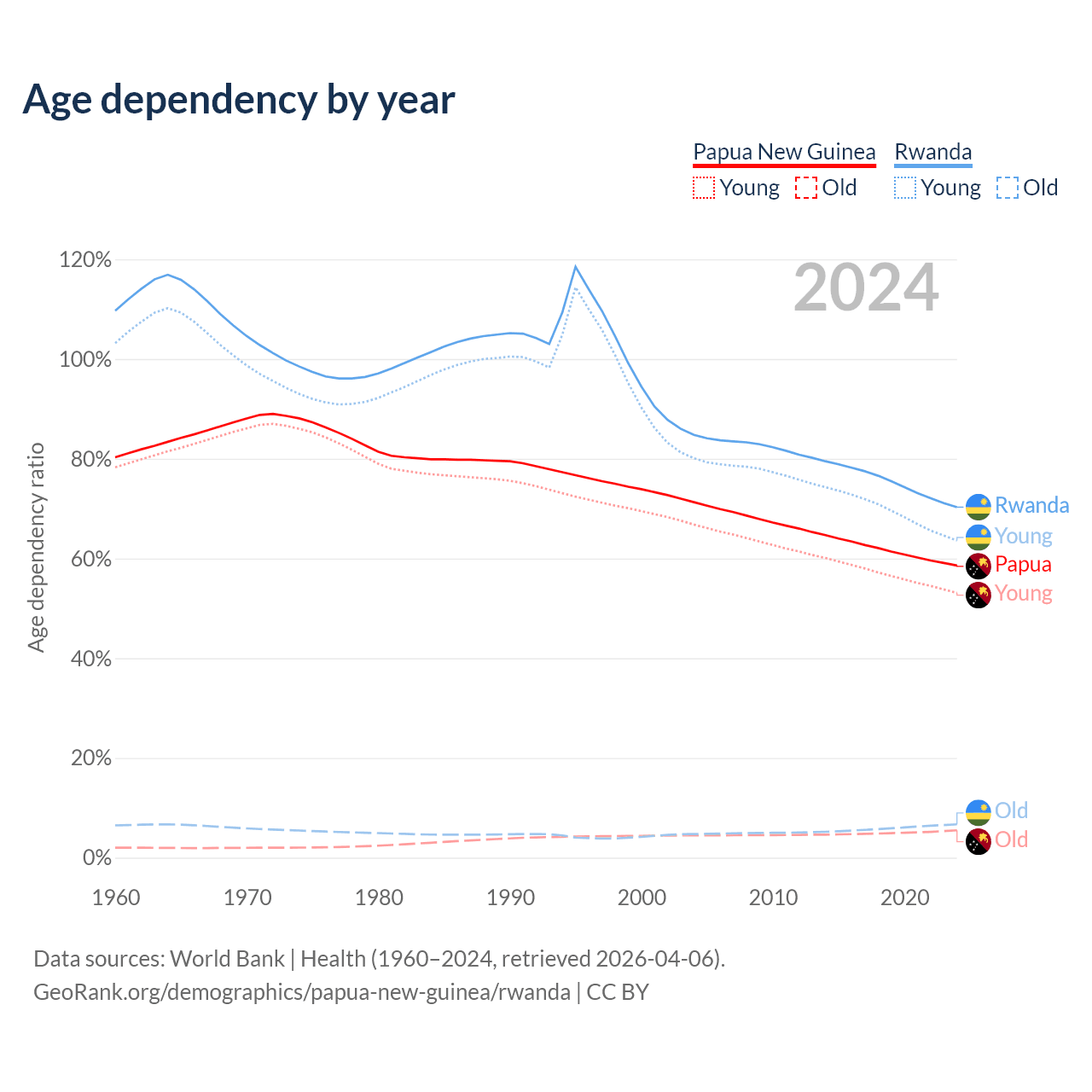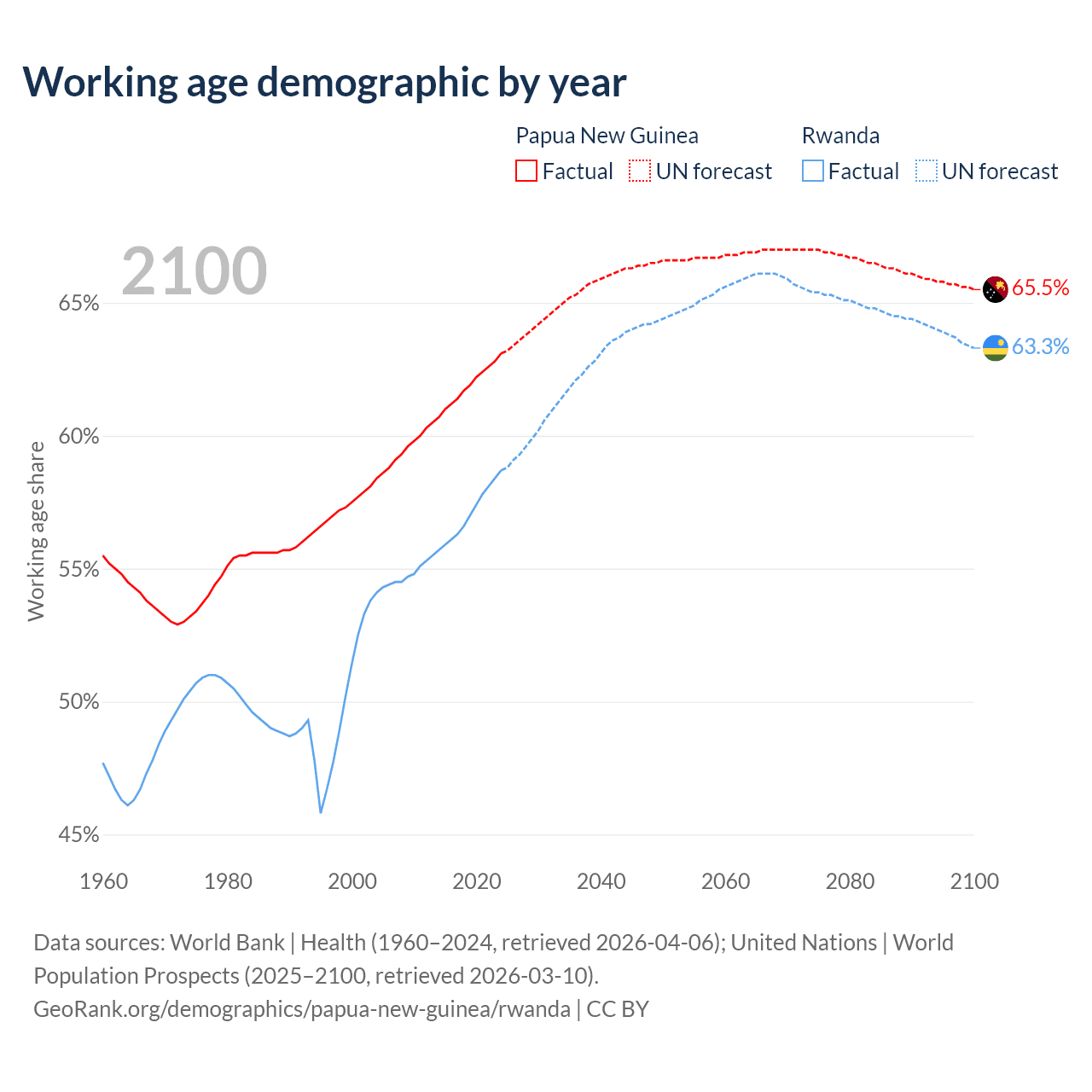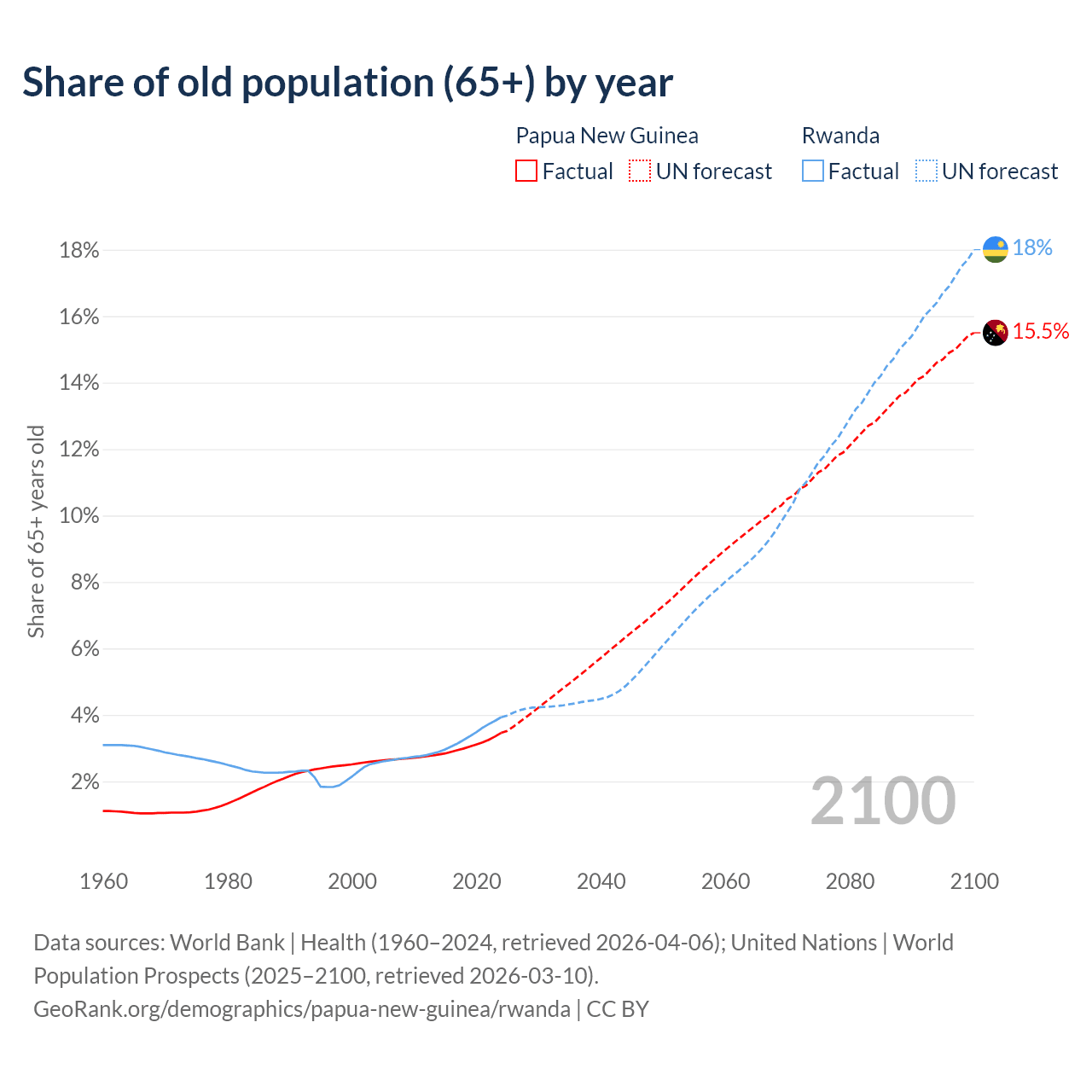- The share of old-age demographic (65+) in Papua New Guinea is 3.46% vs 3.93% in Rwanda.