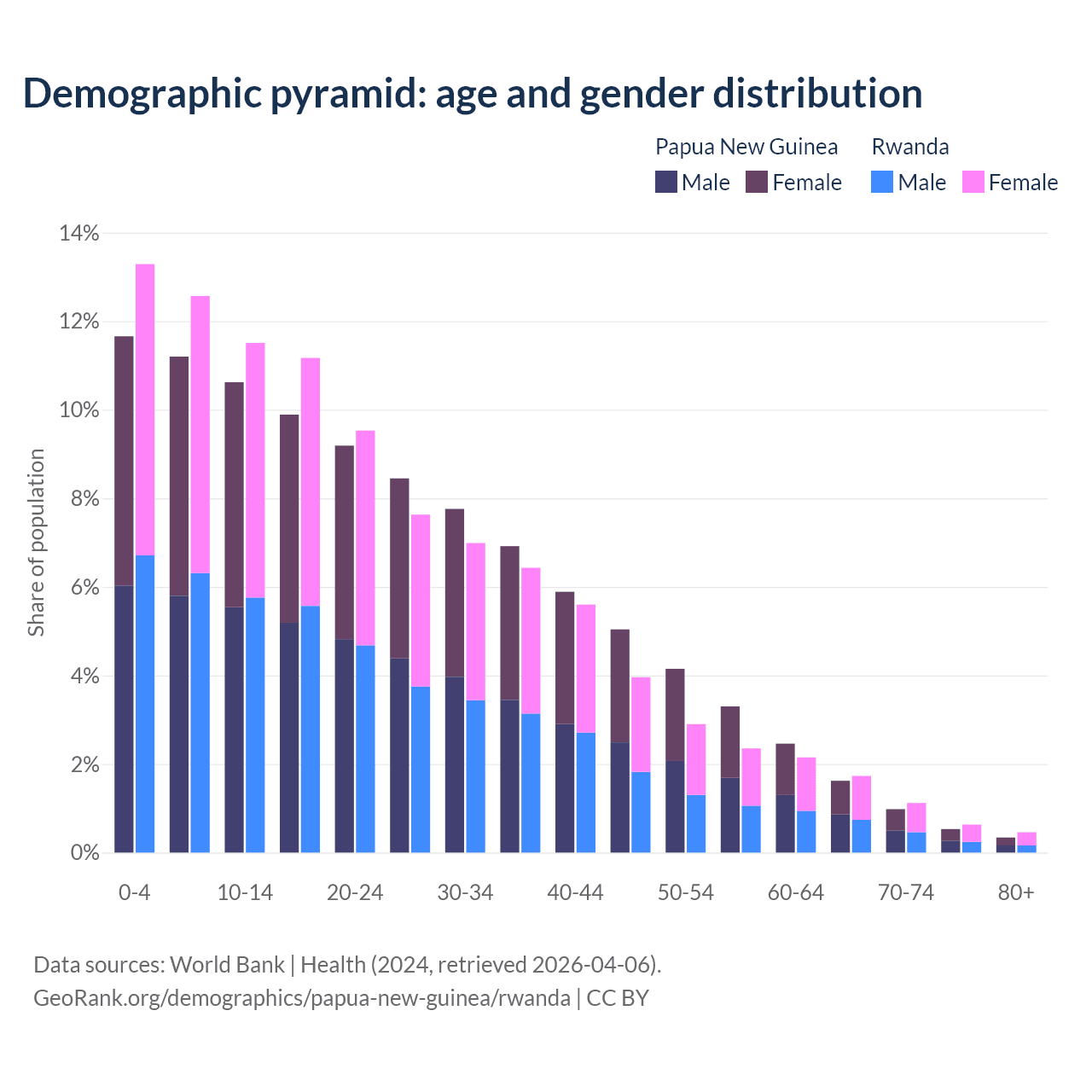 - Papua New Guinea is ranked 140/196 by median age (oldest to youngest) vs 160/196 for Rwanda.