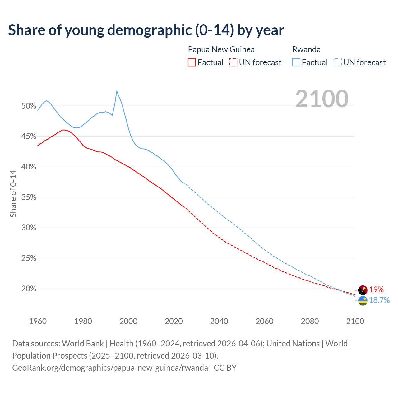 - The share of young demographic (0-15 years old) in Papua New Guinea is 33.5% vs 37.4% in Rwanda.